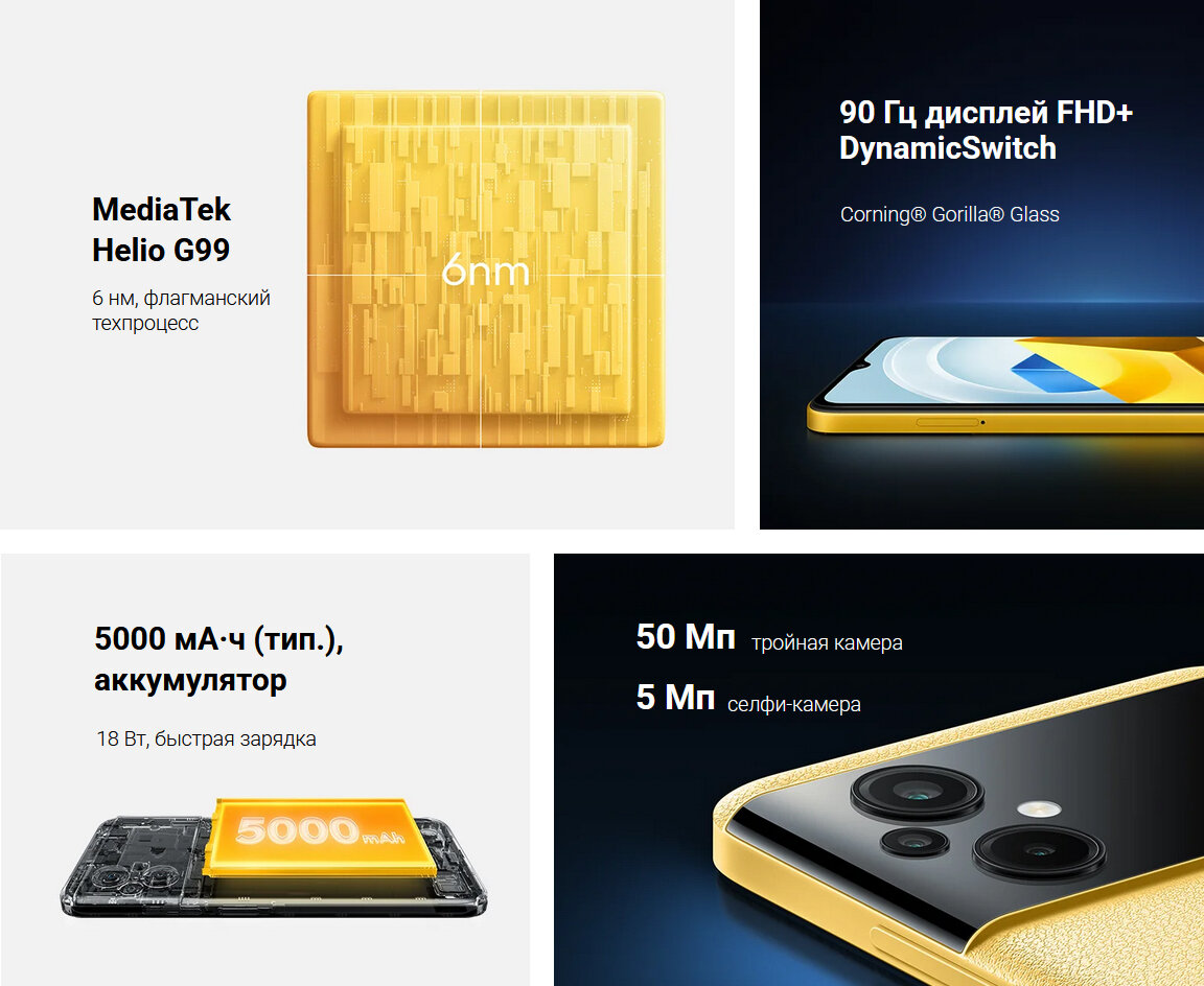 Смартфон Poco M5 имеет 6,58-дюймовый IPS-дисплей с разрешением Full HD+ и частотой обновления 90 Гц. Тройная камера Ultra HD с искусственным интеллектом и усовершенствованной оптимизацией изображения состоит из основного модуля 50-Мп и двух 2-Мп. В основе смартфона лежит процессор Helio G99 — первый в серии, построенный на 6-нм техпроцессе TSMC. Poco M5 поставляется с MIUI 13 поверх Android 12 из коробки. Он весит 201 грамм и оснащён аккумулятором ёмкостью 5000 мАч с поддержкой зарядки мощностью 18 Вт.