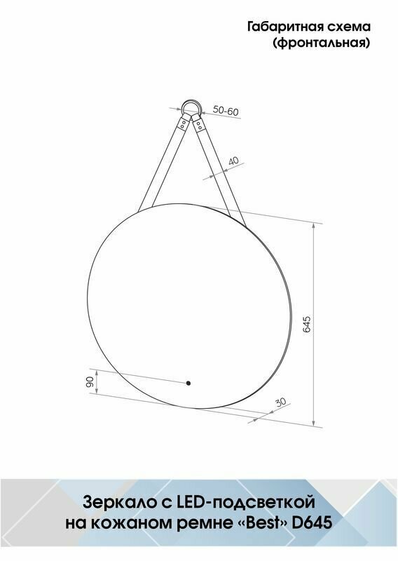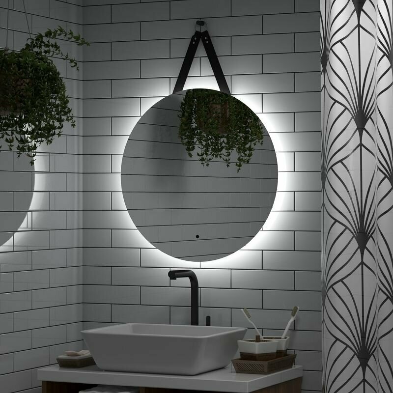 Зеркало с подсветкой " Best Led" D650 на ремне из натуральной кожи черного цвета с бесконтактным сенсором - это настенное зеркало нового поколения, изготовленное из полотна толщиной 4 мм от ведущего европейского производителя AGC. При изготовлении используется светодиодная лента с плотностью диодов 120 шт/м и мощностью 9,6 Вт/м, обеспечивающая яркое и равномерное свечение. " Best Led" D650 на ремне из натуральной кожи черного цвета с бесконтактным сенсором - это круглое зеркало для ванной шириной 65 см, высотой 65 см. Вес зеркала с упаковкой - 6 кг. Для управления подсветкой используется бесконтактный cенсор. Температура ореольной подсветки холодная - 6000К, потребляемая мощность 23 Вт. Основа для изделия - корпус из МДФ в пленке черного цвета. Срок гарантии - 2 года.