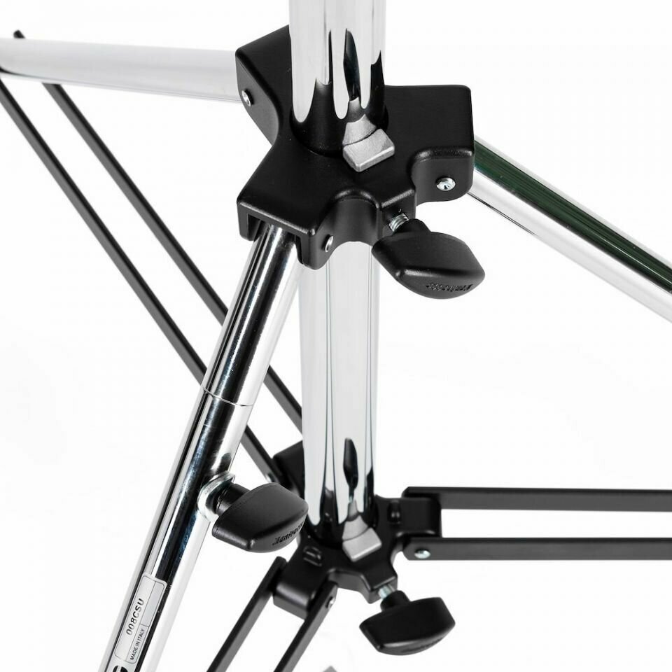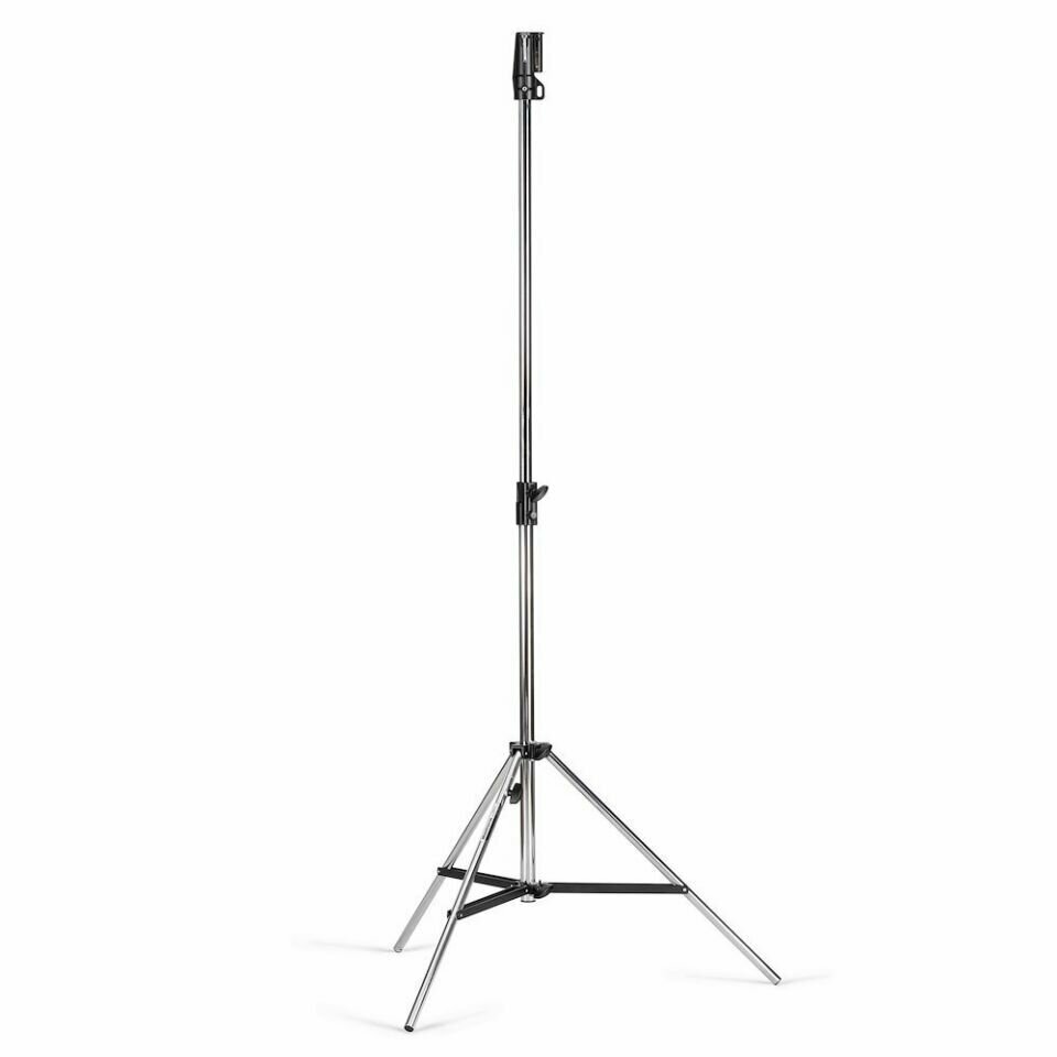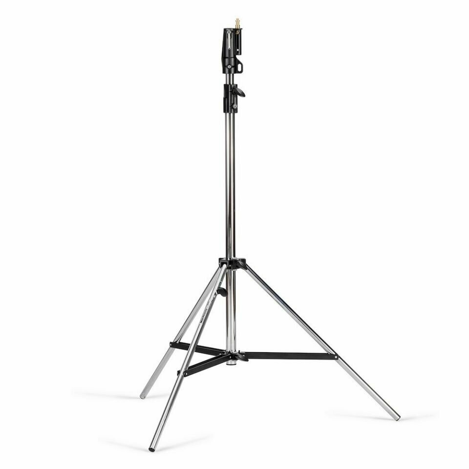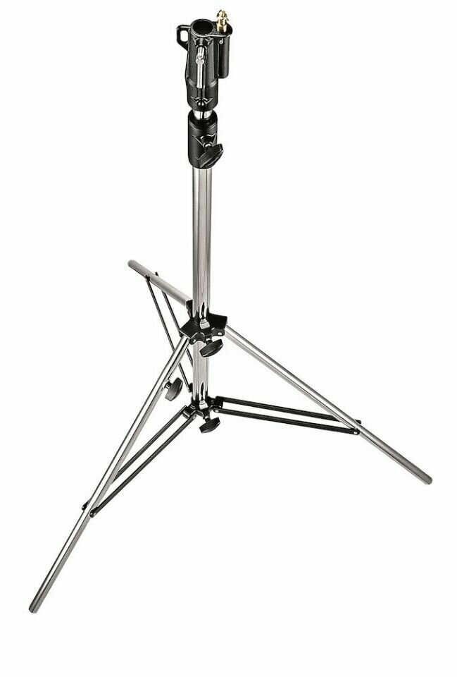 Профессиональная сверхпрочная стойка для локаций и студий. Ноги с двойными распорками для устойчивости и безопасности. Универсальная голова тип 14 с гнездом 28 мм и винтом 16 мм. Хромированные стальные ножки и одна выдвигающаяся секция. 1 выравнивающая ножка для устойчивости на неровной поверхности.