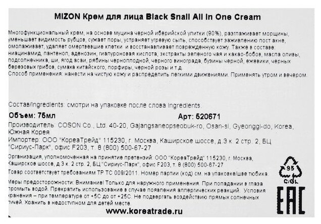 | Активные компоненты | фильтрат секреции улитки, нацинамид, фитостеролы, бета-глюкан, керамиды-3, пантенол, аллантоин, гиалуроновая кислота, матриксил, меди трипептид-1, экстракт какао, уголь древесный, экстракт шиитаке, экстракт черного сахара, экстракт арабского кофе, экстракт коричника китайского, экстракт березовых грибов, экстракт рябины черноплодной, экстракт бузины черной, экстракт черного винограда, экстракт ежевики, экстракт ягод асаи, экстракт плодов черимойя, экстракт черного чеснока, экстракт баклажана, эк |