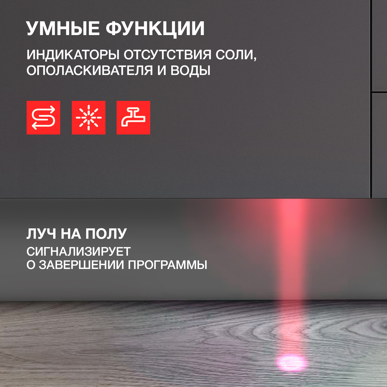 Незаменимая функция отражения луча на полу подскажет, когда посудомоечная машина завершит цикл мытья. Как только индикатор перестанет гореть, это означает окончание процесса, и можно безопасно извлекать чистую посуду