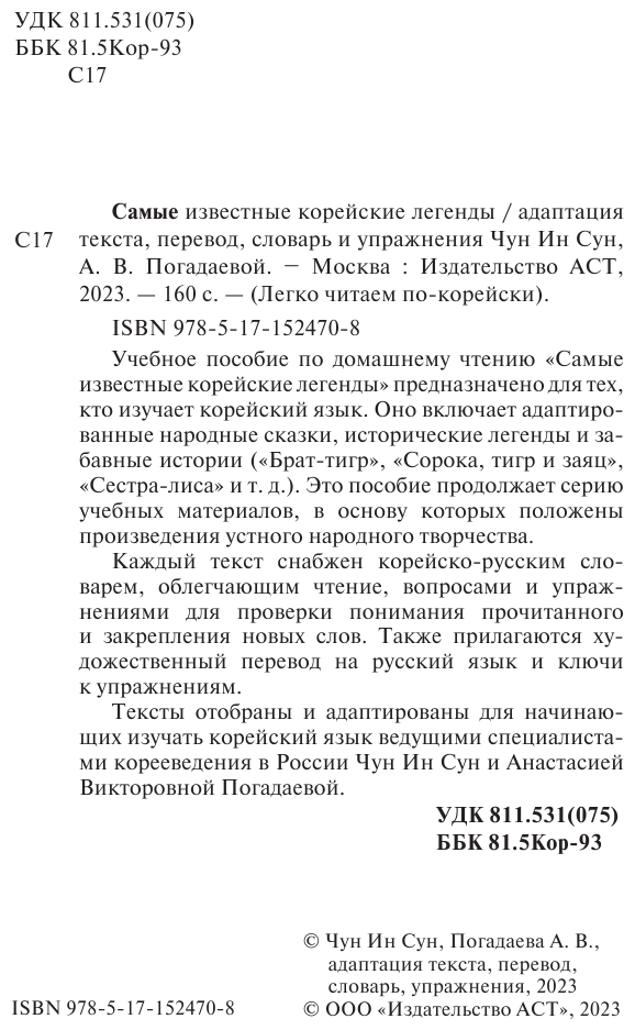 Тексты отобраны и адаптированы для начинающих изучать корейский язык ведущими специалистами корееведения в России Чун Ин Сун и Анастасией Викторовной Погадаевой.