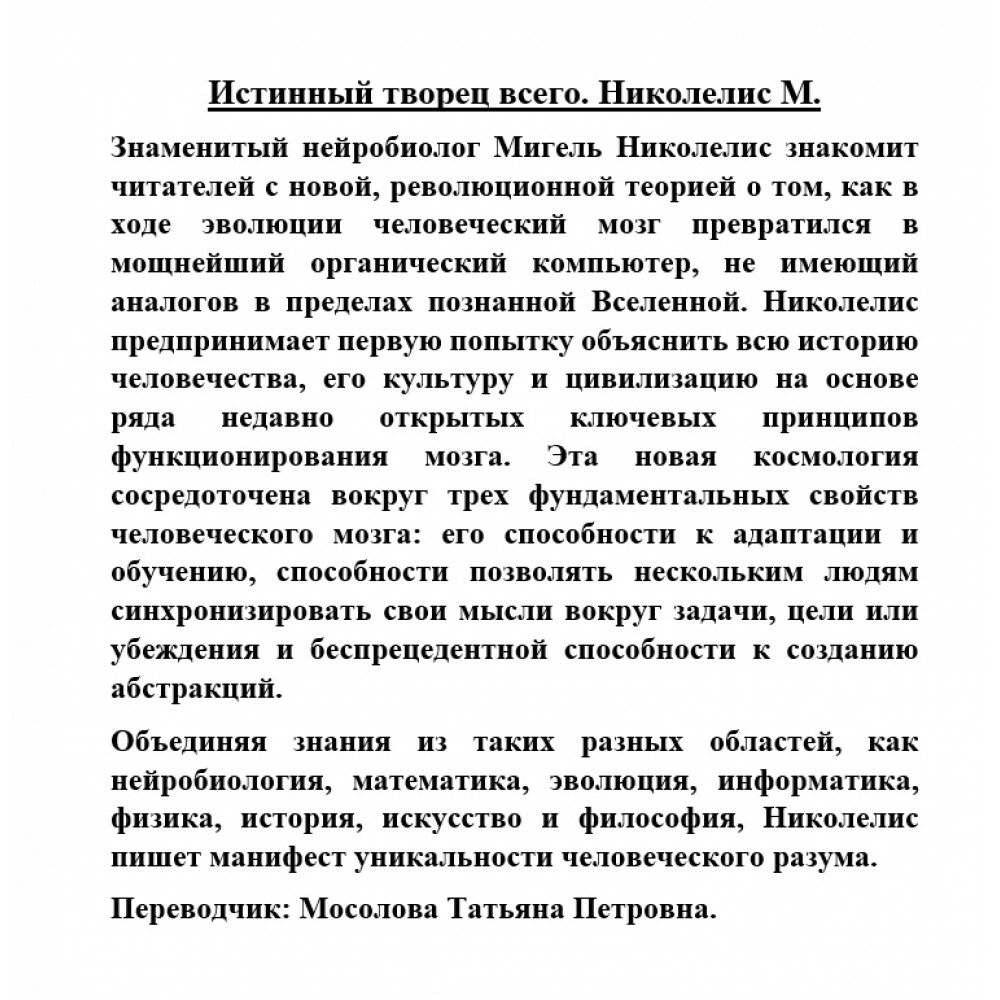 Книга: Истинный творец всего (Николелис Мигель); ИЗДАТЕЛЬСТВО "АСТ", 2023
