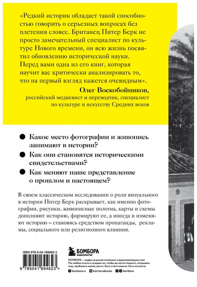 Какое место занимают изображения среди других видов исторических свидетельств? Питер Берк рассматривает графику, живопись, фотографии, кинематограф и другие визуальные источники разных эпох и стран и исследует их практическое использование в истории. Убедительно защищая важность визуального для истории, Берк утверждает, что изображения не следует рассматривать просто как отражение своего времени и места, а скорее как продолжение социальных контекстов, в которых они были созданы, — то есть политического строя, религиозной ситуации, культурных и региональных особенностей.