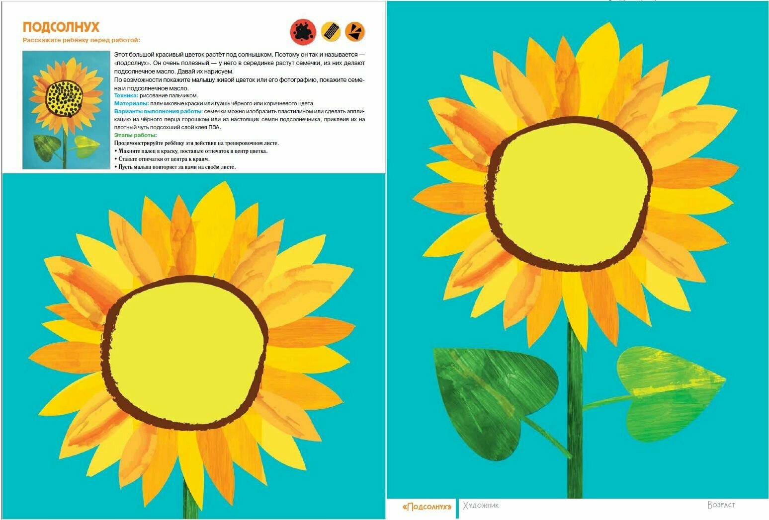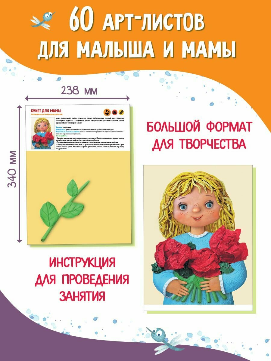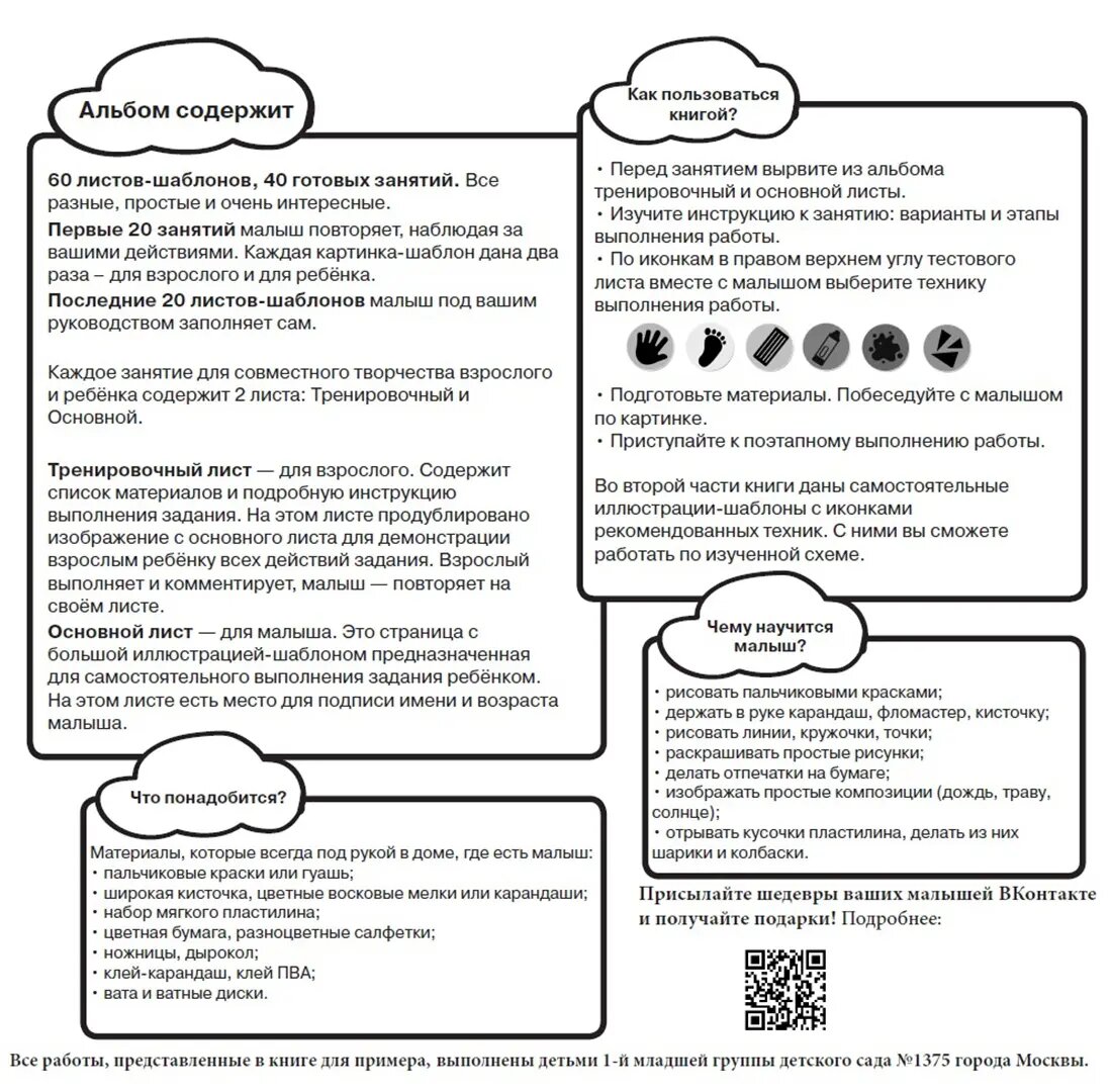 В альбоме 60 арт-листов и 40 готовых занятий. К каждому занятию дан лист для мамы с инструкцией, картинкой для тренировки, советами по предварительной беседе с малышом, описанием материалов и техники выполнения работы. И лист для малыша с большой картинкой для творчества.