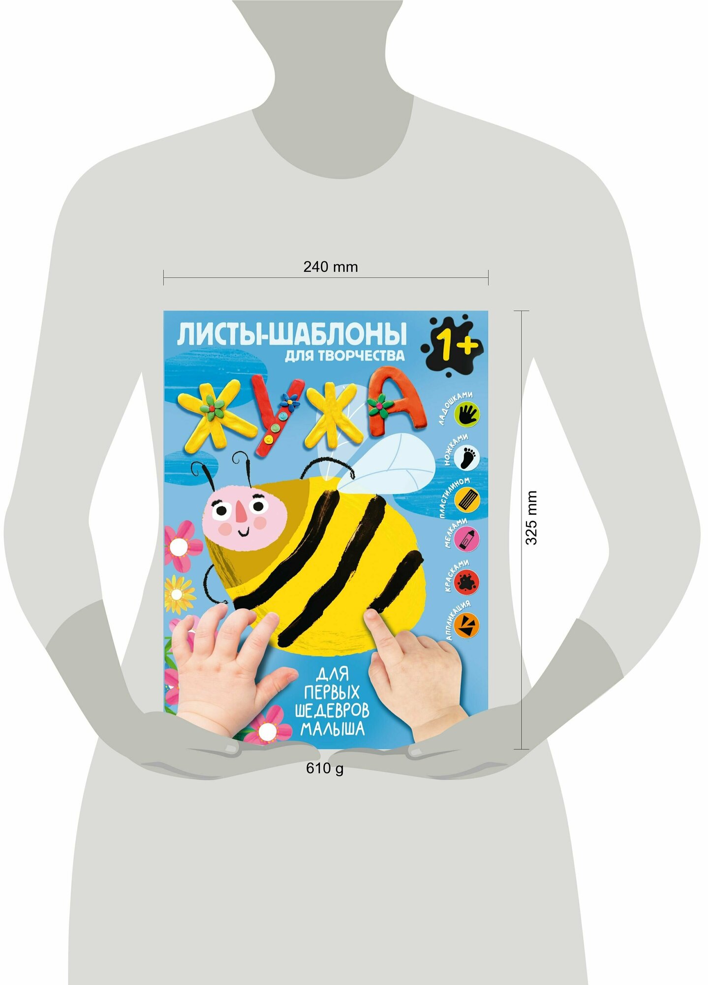 Во-первых, книга неожиданно очень большая и тяжёлая! Потому что рисунки крупные и бумага плотная, не тонкая. Во-вторых, очень прикольные картинки и очень много разнообразных заданий для творчества — можно и отпечатки ладошек и ножек делать и пластилином рисовать и учиться рисовать восковыми мелками и красками. Малышка занимается с удовольствием! Очень очень классная книжка!
