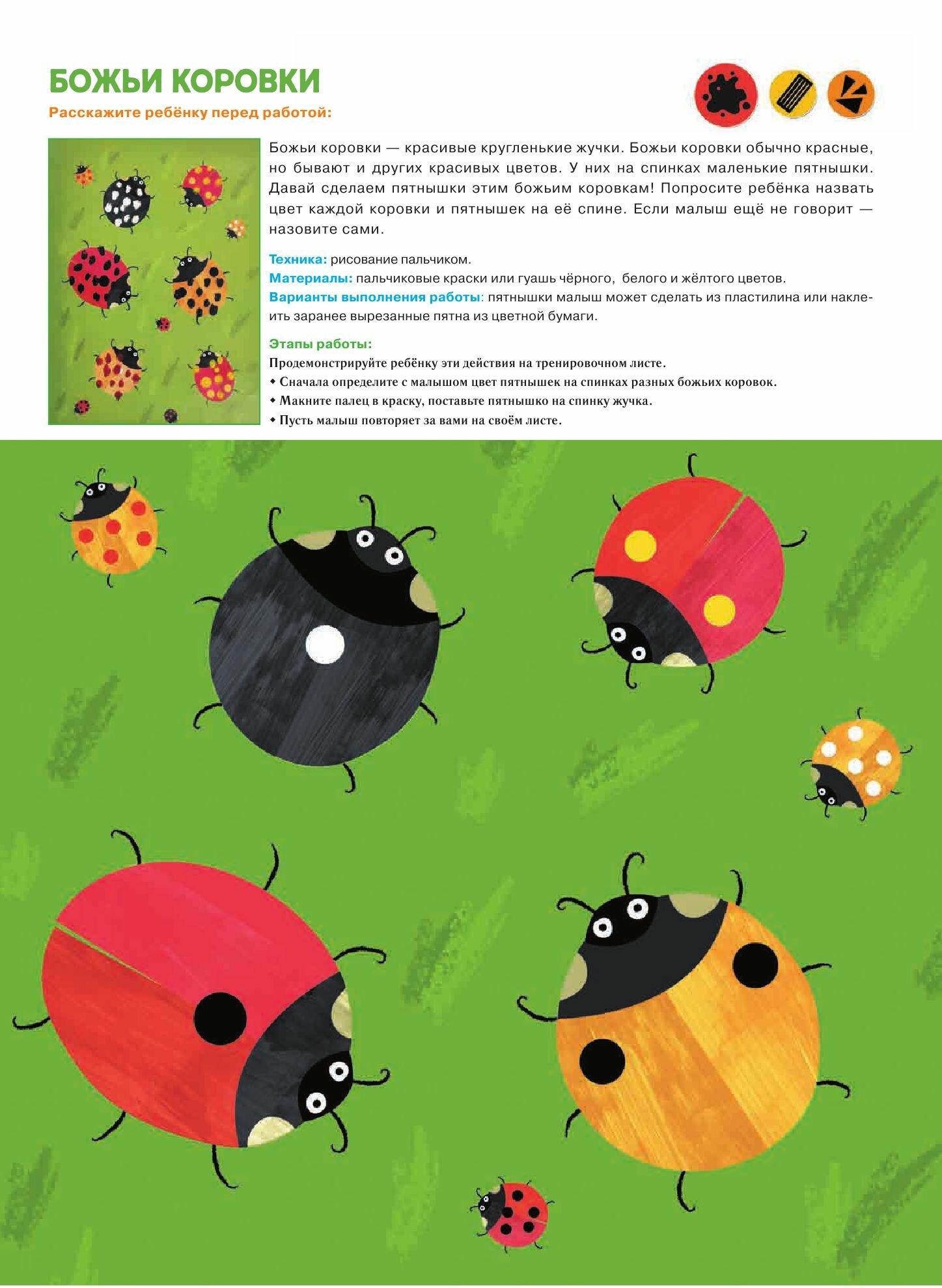 В пособии собраны все развивающие творческие техники для самых маленьких: простая аппликация, рисование ладошками, ножками, пластилином, пальчиками, кисточкой и восковыми мелками.