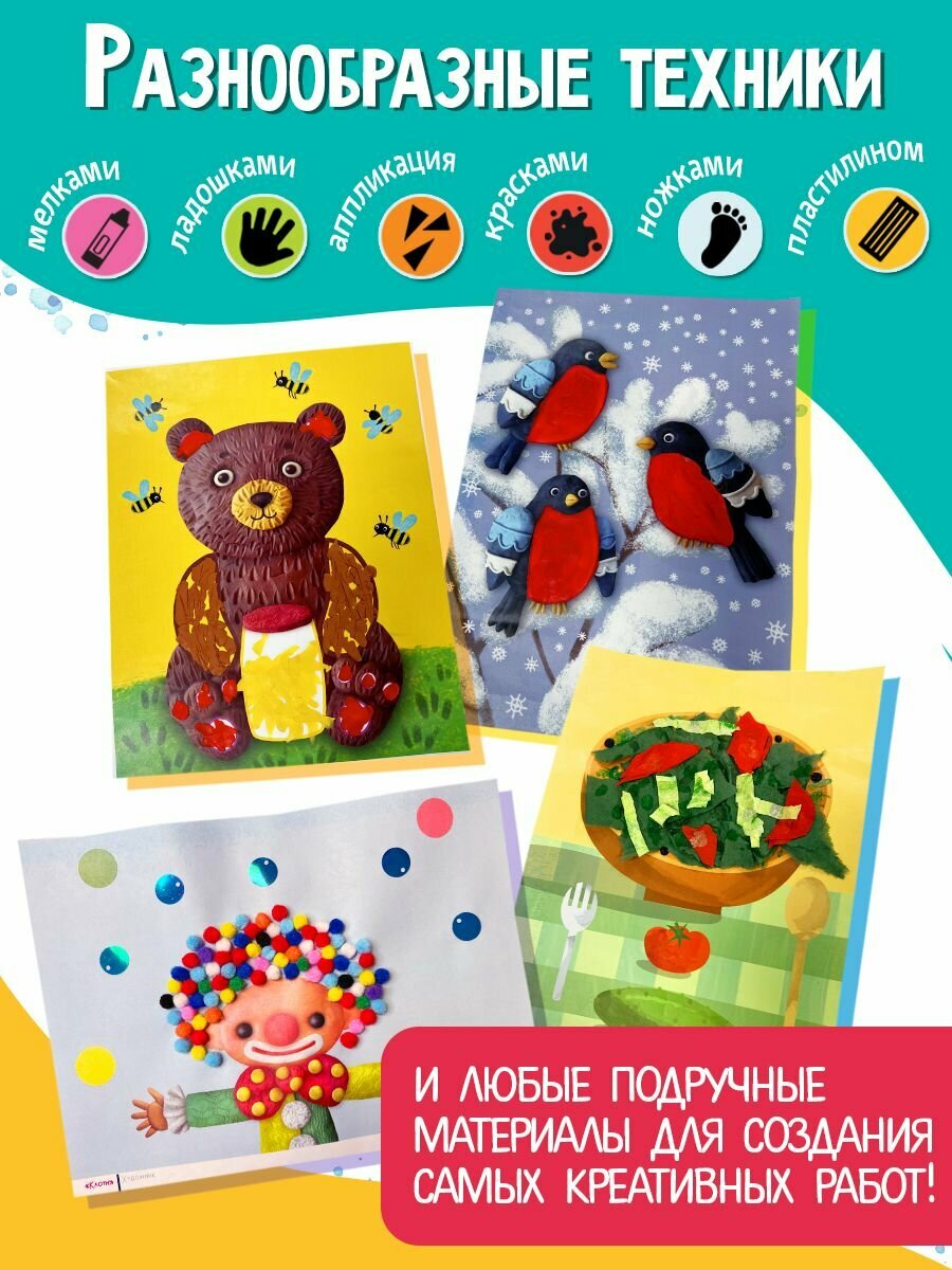 Каждый лист легко отрывается от блока и запечатан только с одной стороны - законченная работа не слипнется со следующими страницами, а краска и пятна от пластилина на обороте работы не испортят других изображений.