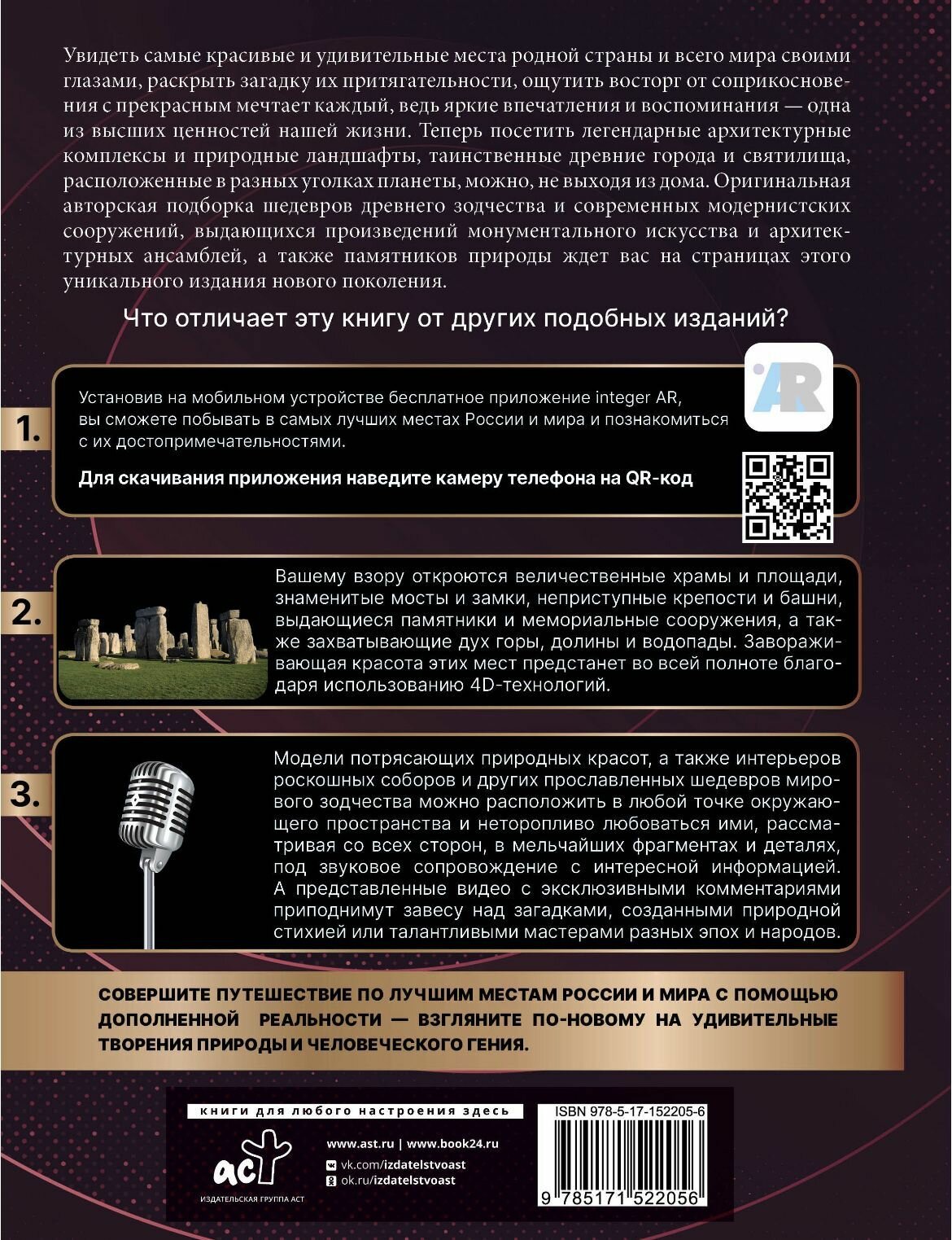 Вместе с этим уникальным изданием с дополненной реальностью вы сможете совершить яркое, запоминающееся путешествие по лучшим местам России и мира. Увлекательный рассказ на страницах книги сопровождают красочные изображения величественных дворцов и соборов, прославленных мостов и башен, загадочных древних святилищ и городов, великолепных памятников и мемориальных комплексов, потрясающих природных ландшафтов и живописных пейзажей. Более того, используя 4D-технологии, вы сможете сполна насладиться красотой всех этих мест, воочию оценив гармонию и совершенство творений природной стихии и человеческого гения. Установив бесплатное приложение integer AR, вы станете участником виртуального тура, включающего самые знаменитые и всемирно признанные достопримечательности, и получите возможность не только рассматривать их в мельчайших фрагментах и деталях, располагая модели и видео архитектурных сооружений, интерьеров и природных красот в любой точке окружающего вас пространства, но и прослушивать занимательную информацию о них.