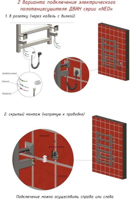 Электрический полотенцесушитель Двин L neo 60х50 4656759179144.Полотенцесушитель с диммером и таймером, телескопический крепеж к стене - 2 шт., маскировочный элемент для скрытой проводки - 2 шт., колодка клемная, кабель с вилкой - 1 шт..