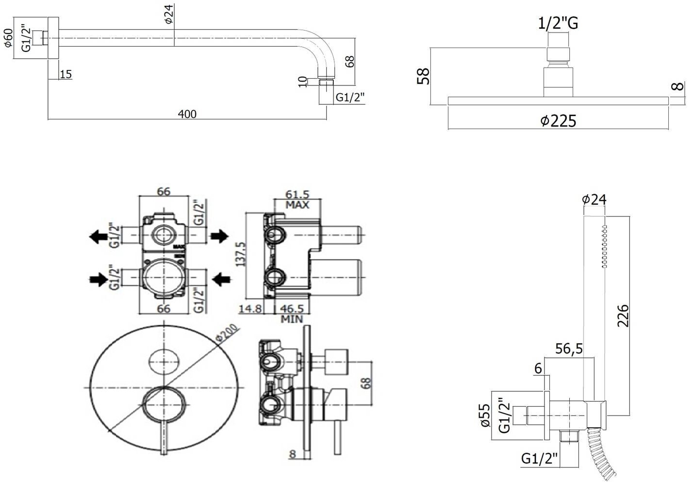 | Состав комплекта | верхний душ, смеситель, шланговое подключение, душевой гарнитур |