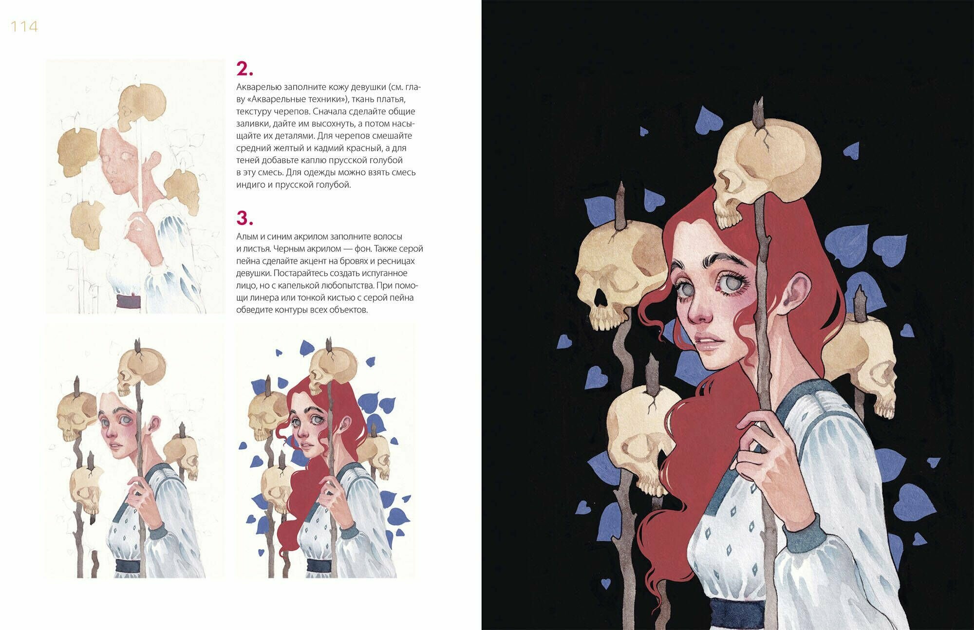 Отличная книга от любимого иллюстратора. Порадовало очень красивое оформление, хорошее качество печати и, конечно, иллюстрации Насти Штарк. Что касается текста: начало вполне стандартное для книг по рисованию: перечислены материалы, необходимые для работы. Раздел хоть и не оригинальный, но очень полезный. Мне, например, пригодилась информация о том, какой вид кисти подходит для определенной работы и интересная расшифровка этикеток акварельных красок (это поможет лучше сориентироваться при выборе акварели, ведь значение имеет не только цвет). Далее Настя показывает несколько акварельных техник, которые сама часто использует и которые пригодятся читателю при работе с мастер-классами. Все довольно понятно, понравится тем, кто боится брать в руки акварель. Затем идет полезный раздел про построение головы (он довольно наглядный и понятный, без академизма). Но изюминка книги, все-таки, раздел про рисование персонажей. Помимо инструкции по построению и заливке цветом, автор рассказывает о своем творческом процессе, о том как подбирались конкретные референсы или трансформировался замысел.