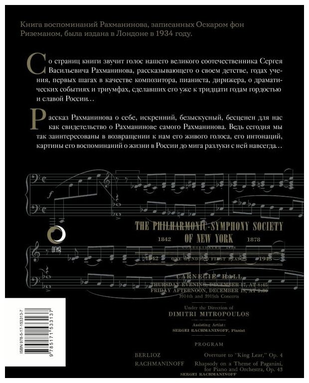 Очень интересные воспоминания о Сергее Рахманинове (1873-1943г.г.), изумительном пианисте, дирижёре и композиторе. В этих мемуарах (важную роль в которых играют и комментарии всех участвующих в из написании и издании) великий музыкант раскрывается не только как гениальный исполнитель и созидатель, но и как человек, которого можно смело можно считать мерилом нравственного стержня. Содержание книги вызывает только одно впечатление- восторг от прочитанного. Но, к сожалению, этого нельзя сказать о работе корректоров, которым зря выплатили зарплату за эту работу: в этом юбилейном издании такое количество опечаток, что даже странно, вроде приличное издательство. И еще о плюсах, -фотографий много, портреты Рахманинова -великолепны.