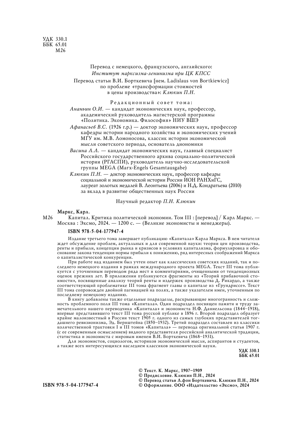 В книгу добавлены также отдельные подразделы, раскрывающие многогранность и сложность проблемного поля III тома "Капитала". Один подраздел посвящен памяти и труду замечательного нашего переводчика "Капитала" и экономиста Н.Ф. Даниельсона (1844-1918), впервые представившего текст III тома русской публике в 1896 г. Второй подраздел образует крайне малоизвестный в России текст 1905 г. одного из самых глубоких представителей тогдашнего ревизионизма Эд. Бернштейна (1850-1932). Третий подраздел составлен из классики количественной трактовки I и III томов "Капитала" - перевода оригинальной статьи 1907 г. (с ее современным осмыслением) видного представителя российской аналитической традиции, статистика и экономиста с мировым именем В.И. Борткевича (1868-1931).