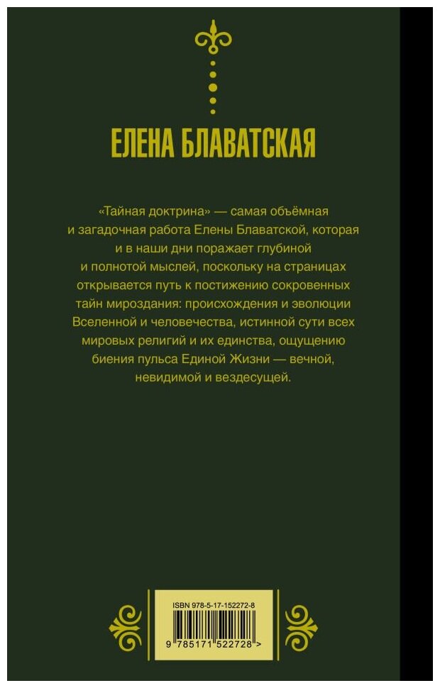 Основные положения "Тайной доктрины" являются основами всех религиозных и философских течений, которые когда-либо знало человечество. В своей работе Елена Блаватская прокладывает новый путь к познанию мироздания: читатель сможет ощутить биение пульса жизни, познать происхождение эволюции Вселенной и человечества, а также найдёт ключ к пониманию истинной сути всех мировых религий и их единства, что ведёт каждого из нас к очищению души и Братсву человечества.