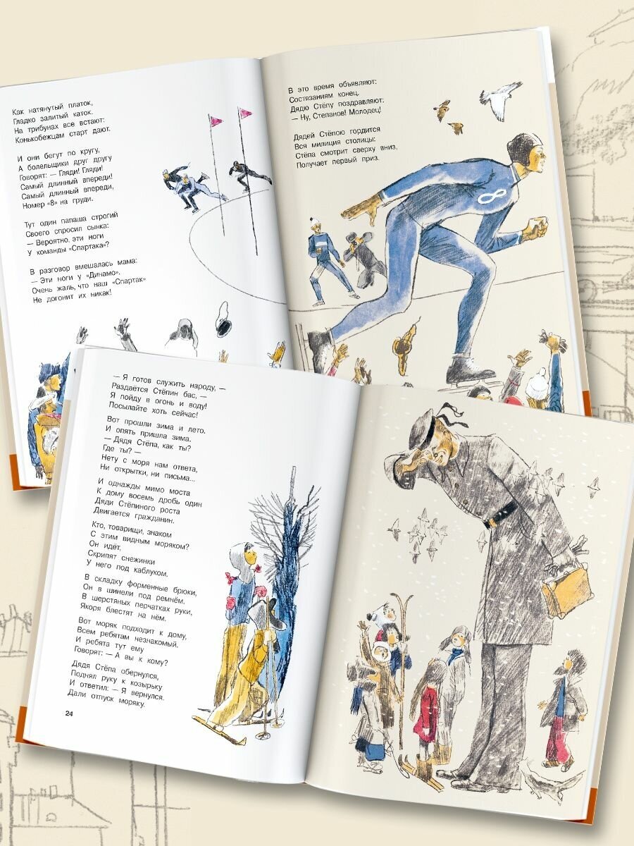 В книгу о Дяде Стёпе вошли ВСЕ 4 ЧАСТИ знаменитой поэмы Михалкова про самого известного милиционера страны, да еще в потрясающих, легко узнаваемых своим неповторимым стилем, иллюстрациях Владимира Гальдяева, встречающие нас абсолютно на каждой странице в книге, включая даже форзац с нахзацем!