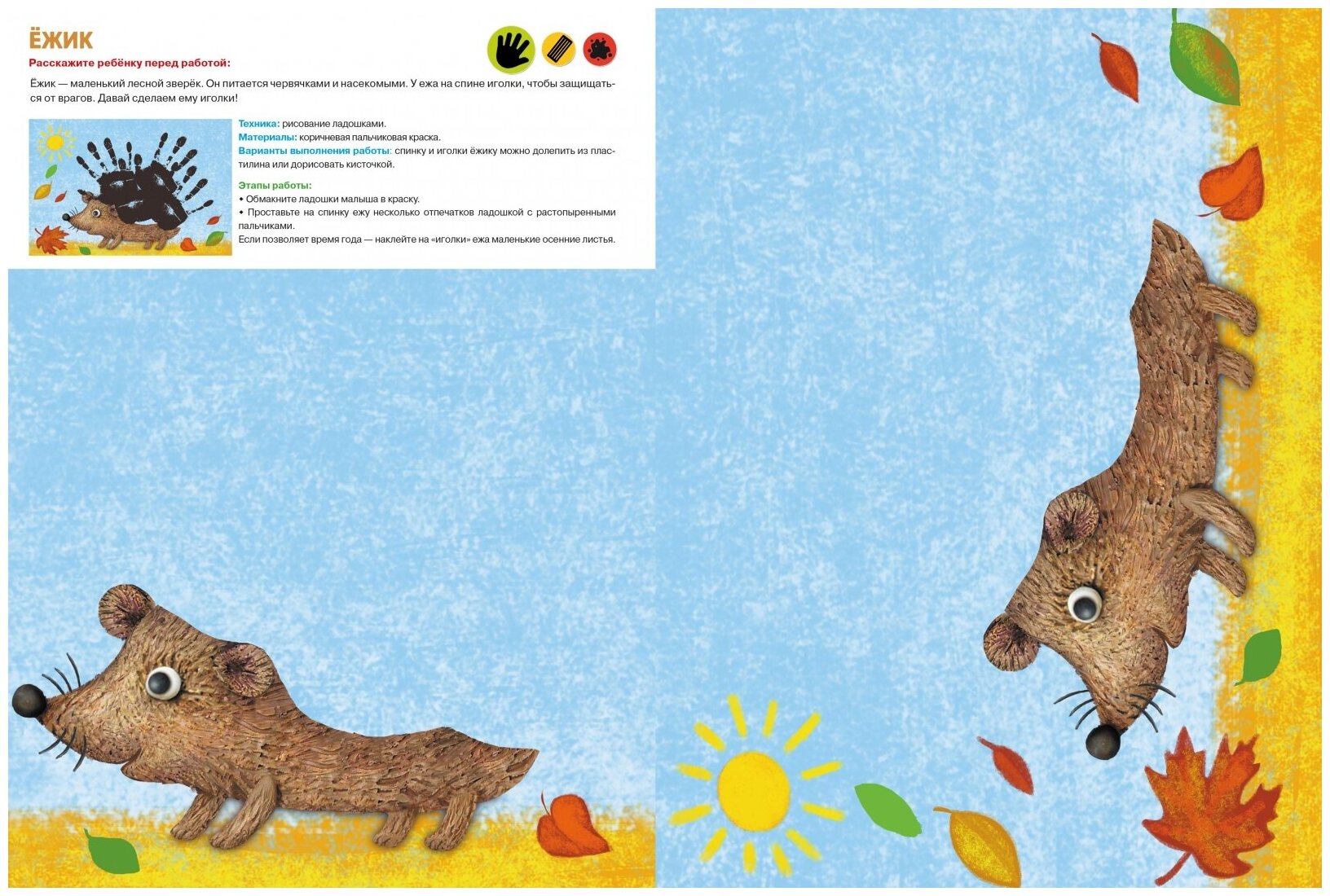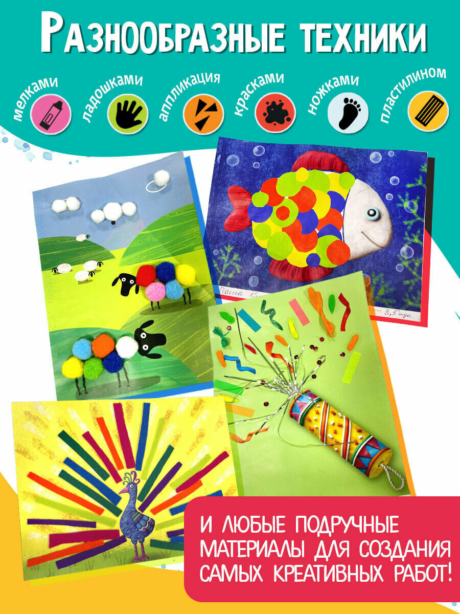 В пособии собраны все развивающие творческие техники для самых маленьких: простая аппликация, рисование ладошками, ножками, пластилином, пальчиками, кисточкой и восковыми мелками.
