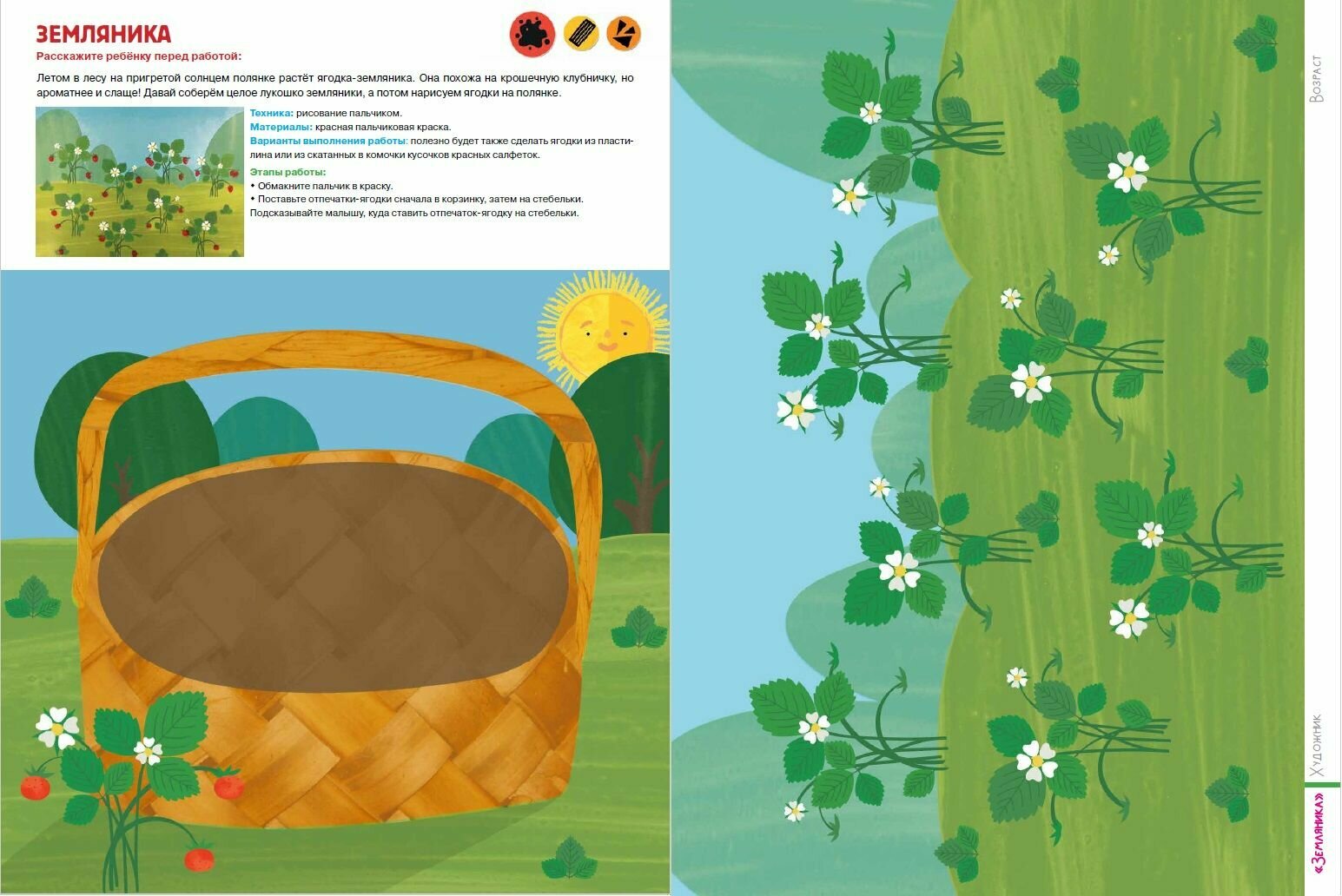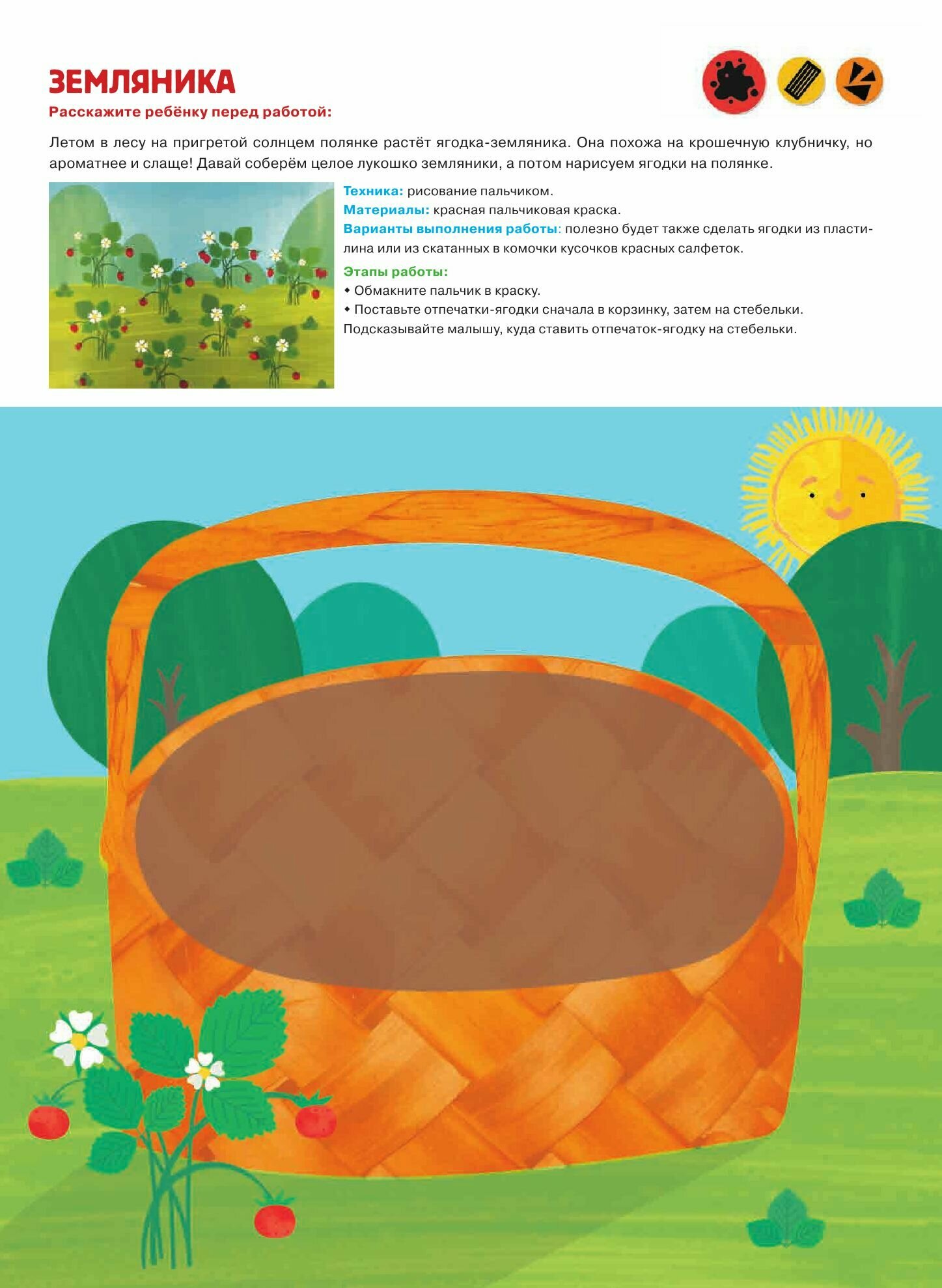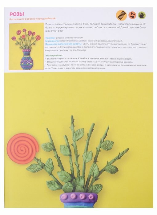 В альбоме 60 арт-листов и 40 готовых занятий. К каждому занятию дан лист для мамы с инструкцией, картинкой для тренировки, советами по предварительной беседе с малышом, описанием материалов и техники выполнения работы. И лист для малыша с большой картинкой для творчества.