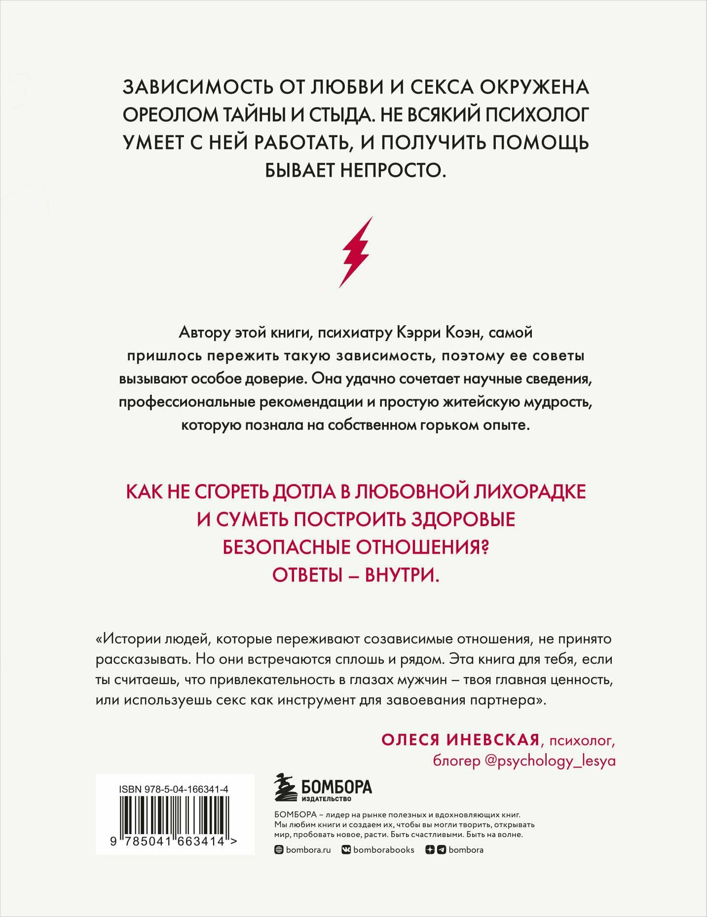 «Истории людей, которые переживают созависимые отношения, не принято рассказывать. Но они встречаются сплошь и рядом. Эта книга для тебя, если ты считаешь, что привлекательность в глазах мужчин — твоя главная ценность, или используешь секс как инструмент для завоевания партнера». — Олеся Иневская, психолог, блогер@psychology_lesya