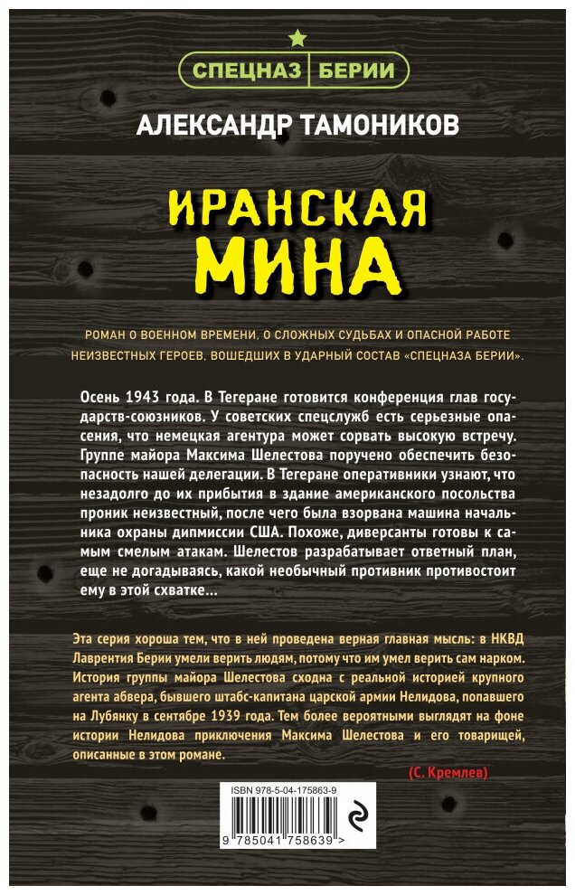 На сегодняшний день товар «Книга: Иранская мина (Тамоников Александр Александрович); ООО "Издательство "Эксмо", 2023» можно купить с кешбеком в 2 магазинах: Читай-город, book24