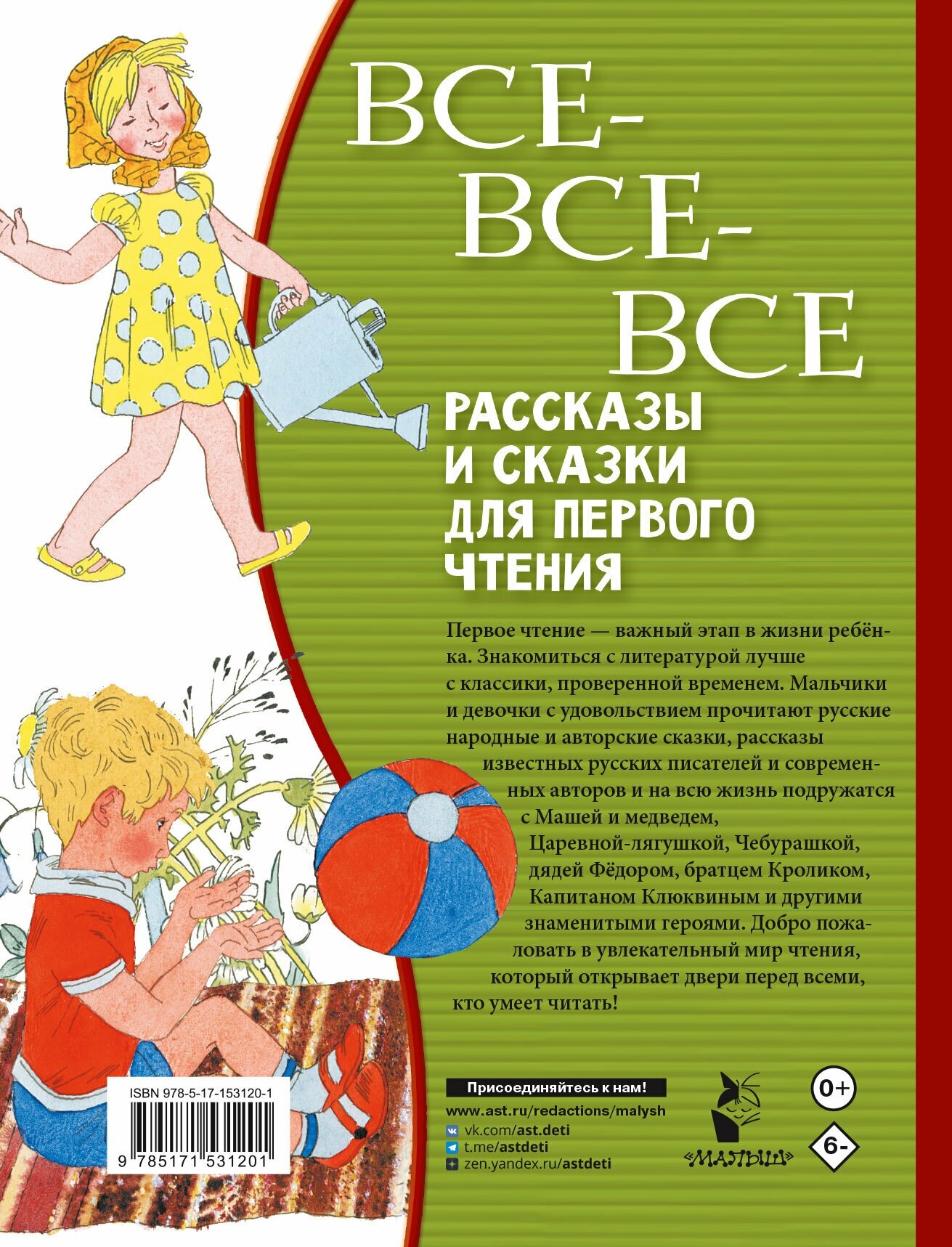 В книгу "Все-все-все рассказы и сказки для первого чтения" вошли самые популярные произведения лучших детских писателей - русских и зарубежных. Это сказки и рассказы Л. Н. Толстого, М. Зощенко, А. Аверченко, В. Катаева, К. Паустовского, Л. Пателеева, И. Пивоваровой, В. Осеевой, С. Михалкова, В. Сутеева, В. Драгунского, Ю. Коваля, Э. Успенского, Х. К. Андерсена, Дж. Ч. Харриса, Братьев Гримм и других. Простые тексты и знаменитые герои помогут детям полюбить чтение на всю жизнь.