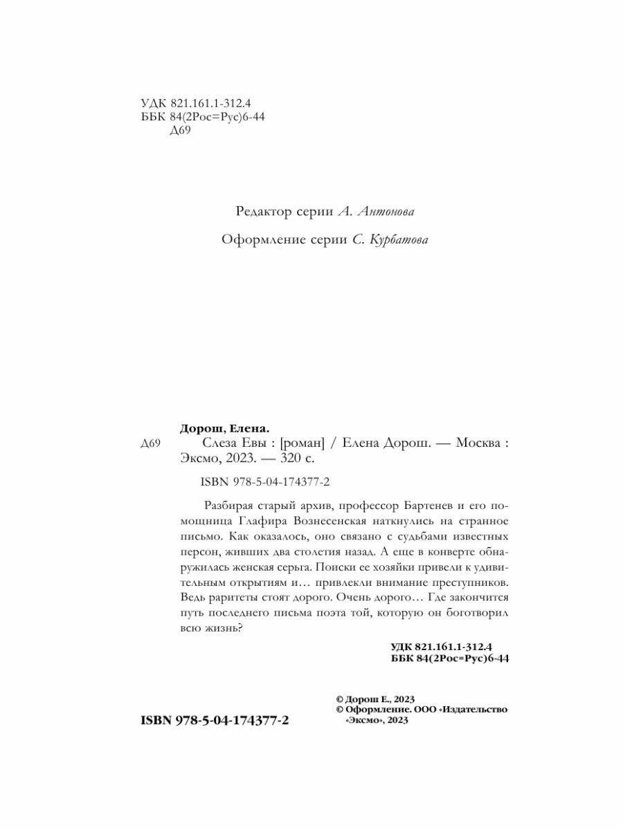 Книга: Слеза Евы (Елена Дорош); Эксмо, Редакция 1, 2023
