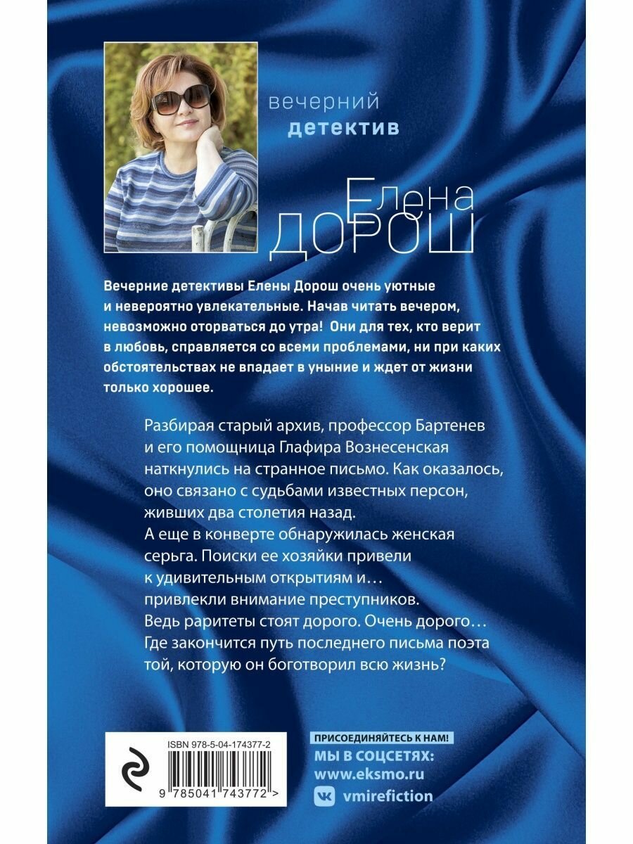 Елена Дорош продолжает радовать читателей интересными детективами. "Слеза Евы" - это книга не только о преступлении, но и немного об истории первой (с лицейских времен), хотя и платонической любви незабвенного нашего Александра Сергеевича Пушкина к красивой, грациозной и доброжелательной императрице Елизавете Алексеевне, супруге императора Александра I. Император слишком любил женщин и уделял мало времени своей жене, а потому Елизавета завела роман с князем Адамом Чарторыйским, потомок которого (по версии автора) и приобрел украденный артефакт. В наше время письмо Александра Сергеевича к Елизавете, написанное им в год его смерти, и серьга императрицы, вложенная в письмо, случайно оказались в руках ученого-филолога, но были похищены преступниками. И в расследование этого преступления будут вовлечены не только полицейские и следователи, но и другие персонажи - Глафира, ухаживающая за ученым, ее приемная мать тетя Мотя - безусловно, один из самых колоритных персонажей, Сергей Шведов, врач, пострадавший в горячей точке,и его сын Ярик... Сюжет динамичный, интрига закручена, персонажи реалистичные. Читается книга с большим интересом. И пусть это художественное произведение, но оно дает возможность прикоснуться к великому наследию и вспомнить лишний солнце русской поэзии - Александра Пушкина.