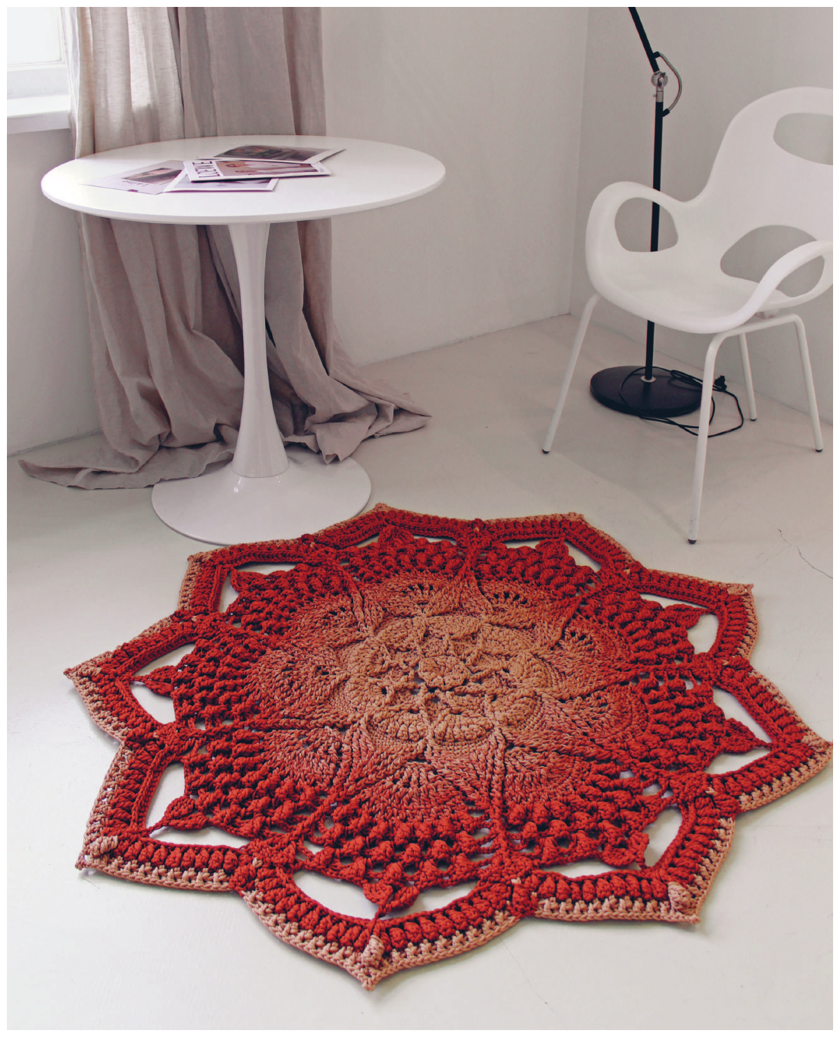 Невероятно сложные визуально, рельефные ковры далеко не так страшны в изготовлении: вязать такое изделие совсем не трудно. Справится даже начинающий! Освоив простые элементы вязания крючком — воздушные петли, столбики с накидами и т. п. и имея желание научиться чему-то новому, вы сможете связать любой рельефный ковер, а со временем научитесь изменять узор по своему усмотрению и даже придумывать собственные дизайны! Сделайте ваш интерьер неповторимым с коврами ручной работы, которые вы свяжете самостоятельно!