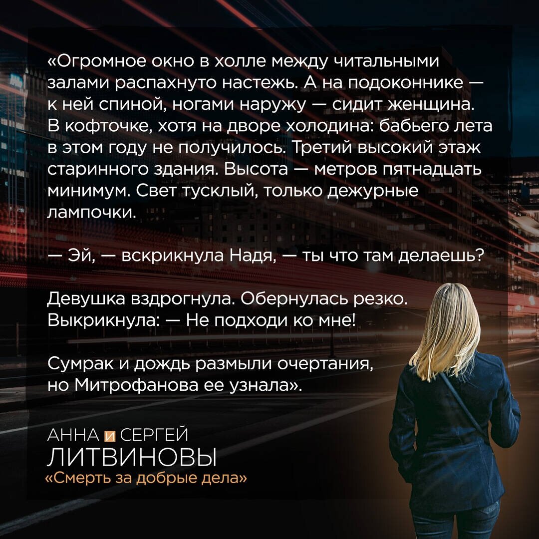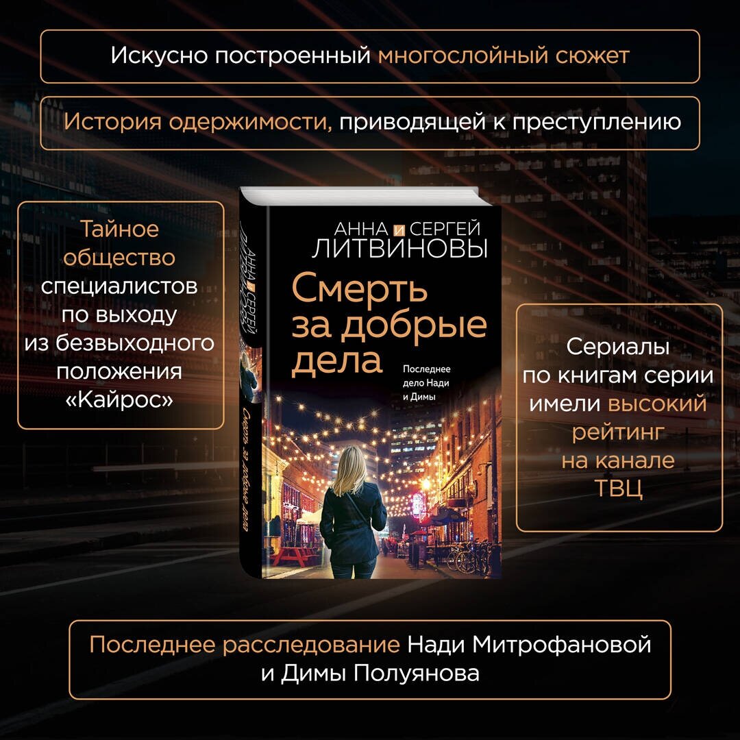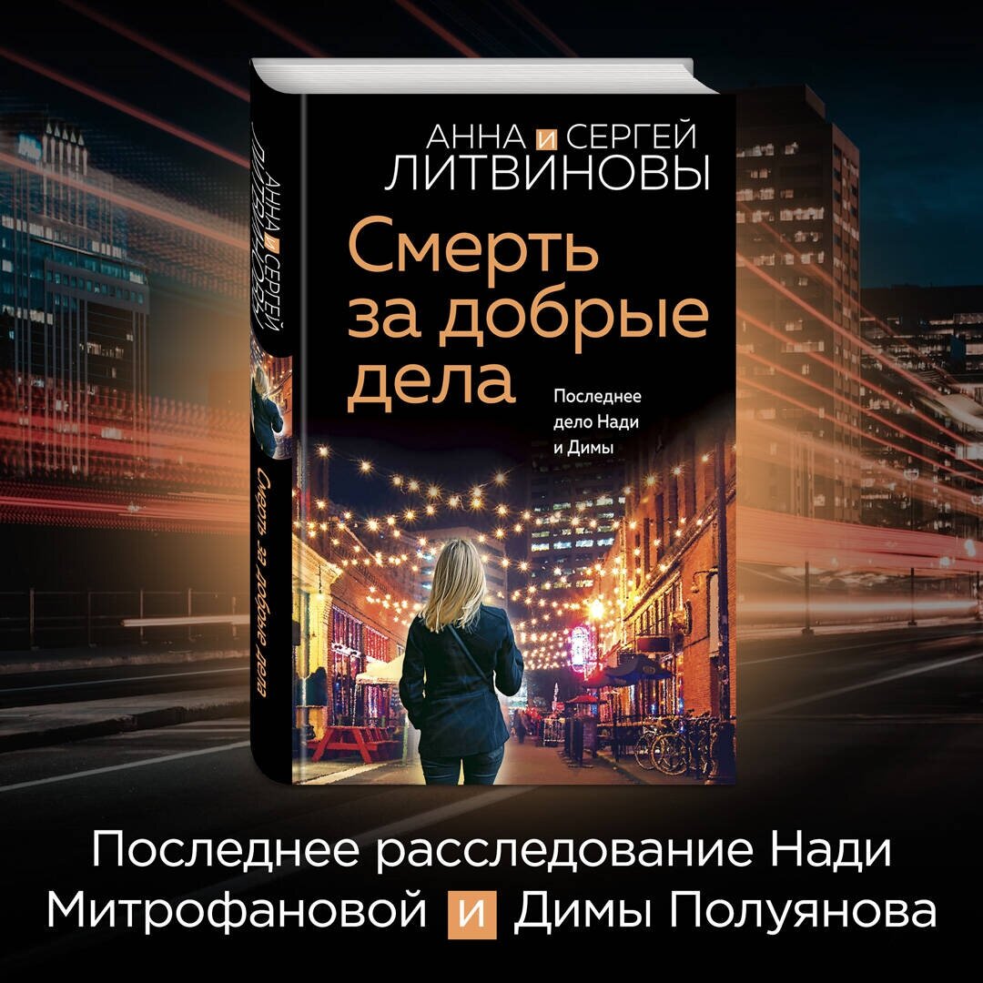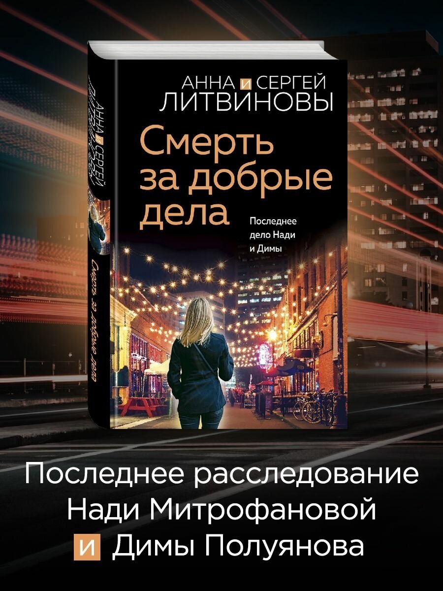 В новом остросюжетном романе Анны и Сергея Литвиновых «Смерть за добрые дела» возвращаются любимые герои — журналист Дима Полуянов и его подруга, библиотекарь Надя Митрофанова.