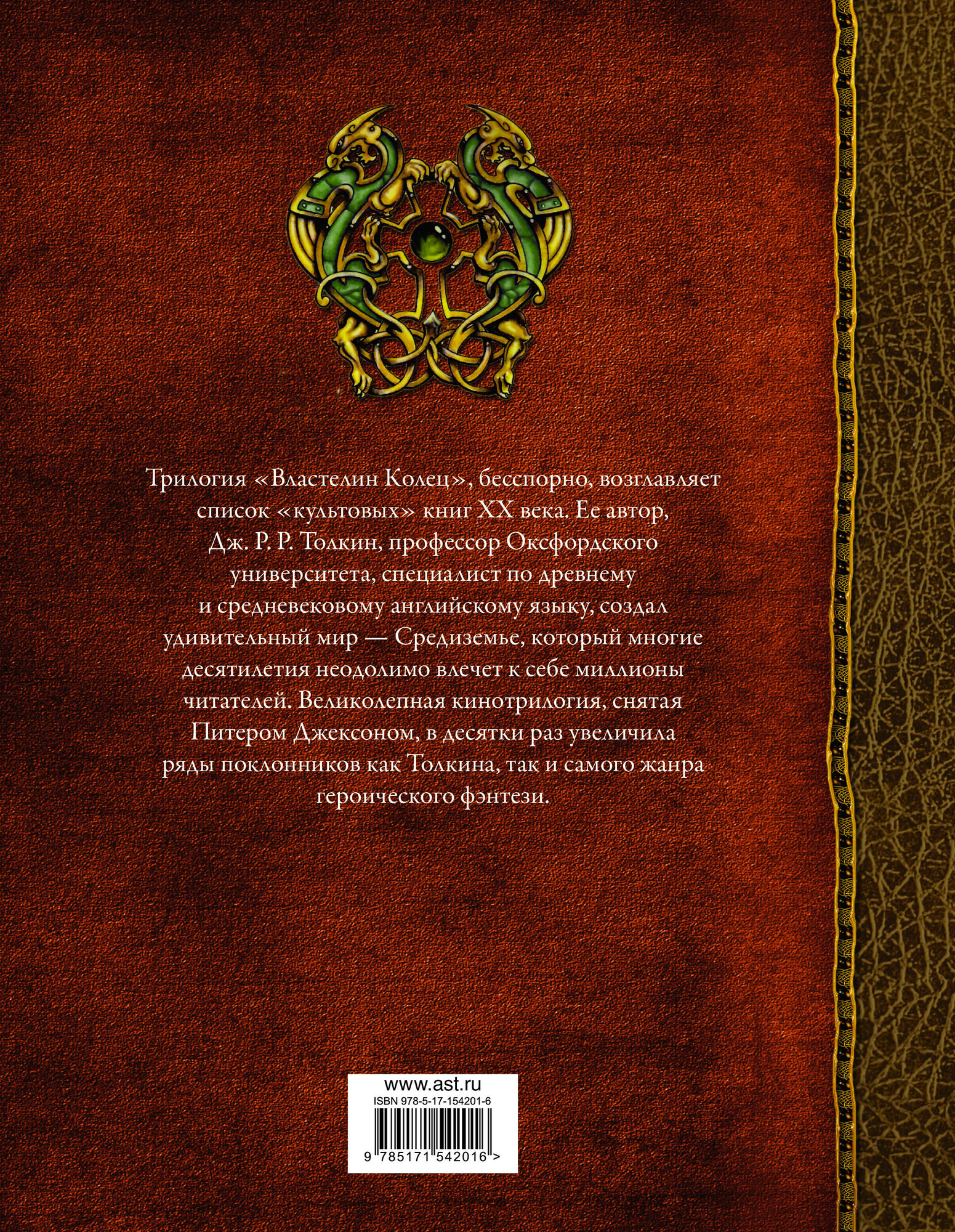 Думаю мусолить в тысячный раз сюжет книги не имеет ни какого смысла, Толкиен создал великолепный фантастический мир. Сама история уже зачитана до дыр и растаскана другими авторами в свои произведения. Данное издание скорее является коллекционным, трилогия в одном томе, несколько не удобно читать. Отличная обложка с кадрами из экранизации и иллюстрациями, тонковатые листы и откровенно мелкий шрифт, что тоже не способствует комфортному чтению. Так что произведение 10/10, а вот конкретное издание 7/10.