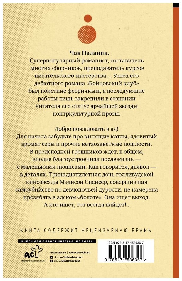 Знакомство с творчеством Паланика началось этой книги. И мне ОЧЕНЬ понравилось! Смелый, саркастичный, местами смешной и заставляет задуматься. Тринадцатилетняя мертвая девочка Мэдисон Спенсер просыпается в аду и такого ада вы еще не видели.