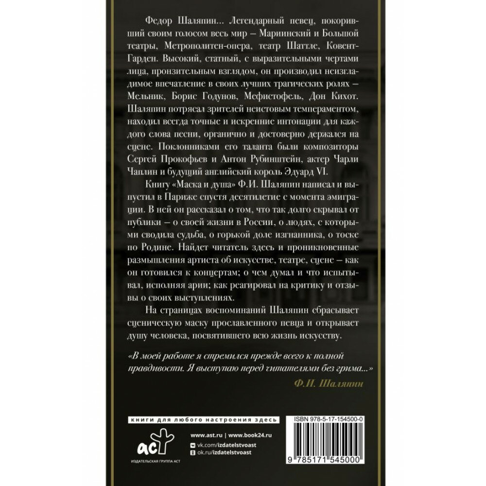 Книгу "Маска и душа" Ф.И. Шаляпин написал и выпустил в Париже спустя десятилетие с момента эмиграции. В ней он рассказал о том, что так долго скрывал от публики — о своей жизни в России, о людях, с которыми сводила судьба, о горькой доле изгнанника, о тоске по Родине. Найдет читатель здесь и проникновенные размышления артиста об искусстве, театре, сцене — как он готовился к концертам; о чем думал и что испытывал, исполняя арии; как реагировал на критику и отзывы о своих выступлениях.