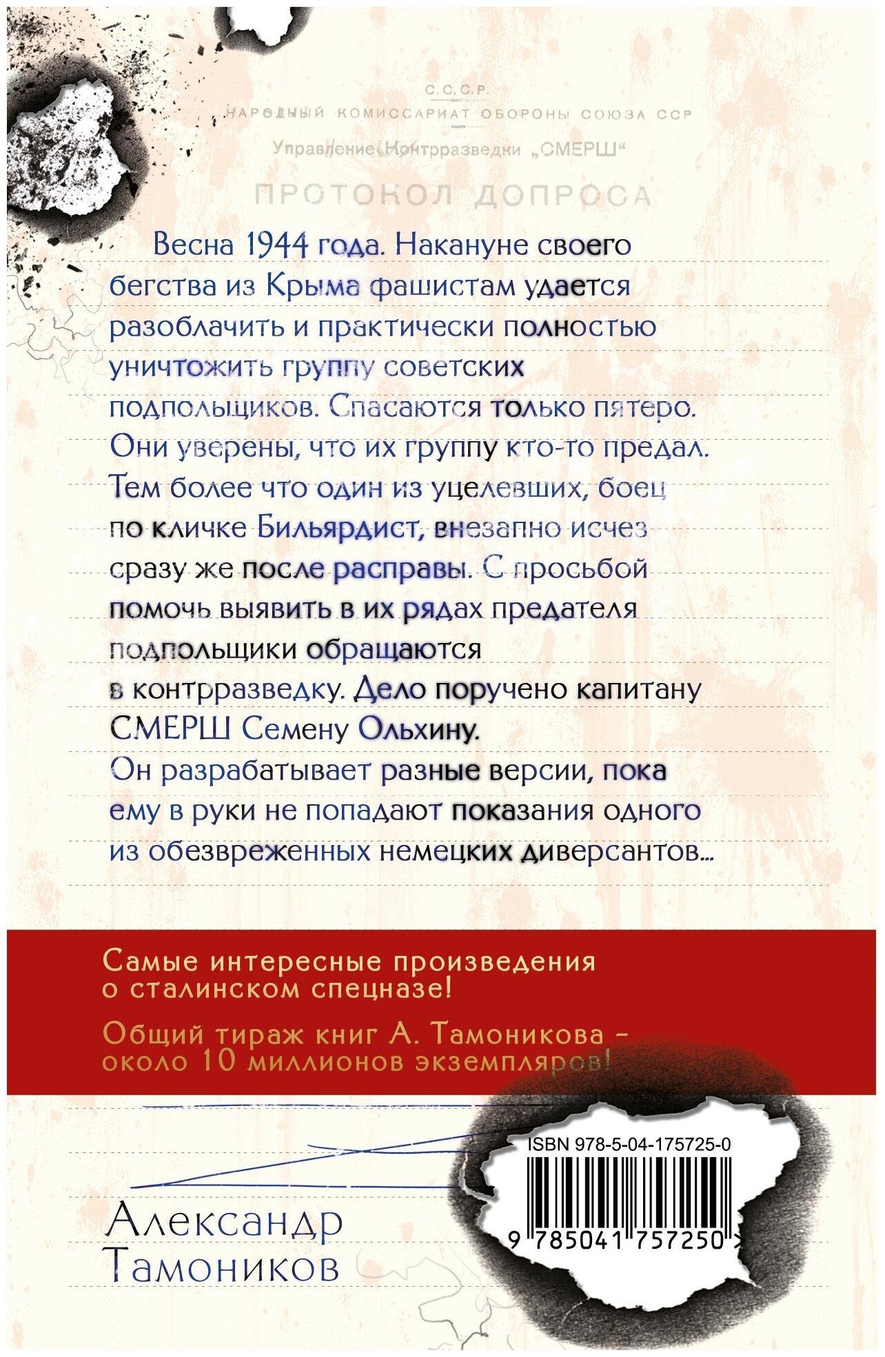 Весна 1944 года. Накануне своего бегства из Крыма фашистам удается разоблачить и практически уничтожить группу советских подпольщиков. Спасаются только пятеро. Они уверены, что их группу кто-то предал. Тем более что один из уцелевших, боец по кличке Бильярдист, внезапно исчез сразу же после расправы. С просьбой помочь выявить в их рядах предателя подпольщики обращаются в контрразведку. Дело поручено капитану СМЕРШа Семену Ольхину. Он начинает прорабатывать разные версии, пока ему в руки не попадают показания одного из обезвреженных немецких диверсантов…