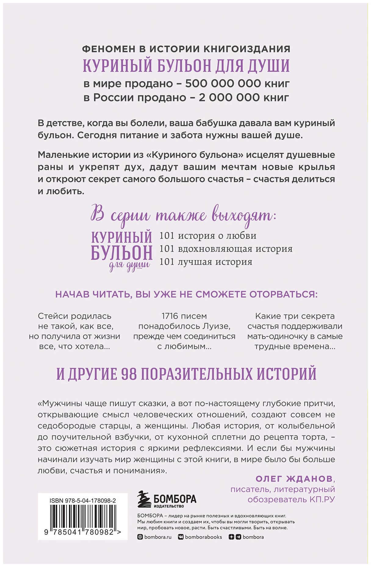 На сегодняшний день товар «Книга: Куриный бульон для души: 101 история о женщинах (новое оформление) (Хансен Марк Виктор, Кэнфилд Джек, Рид Хоуторн Дженнифер); Бомбора, 2023» можно купить с кешбеком в 1 магазине: book24