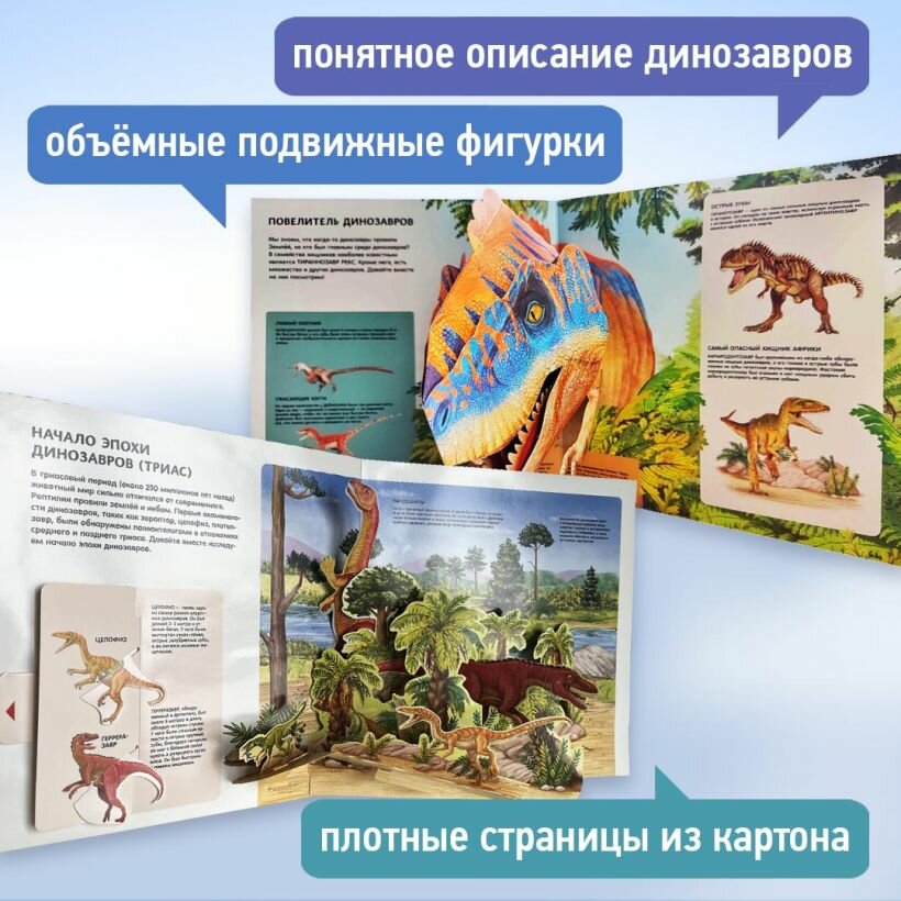 Ваш ребёнок мечтает разгадать секреты динозавров? Объёмные подвижные фигурки древних ящеров выпрыгнут ему навстречу прямо со страниц этой уникальной книги-панорамки!