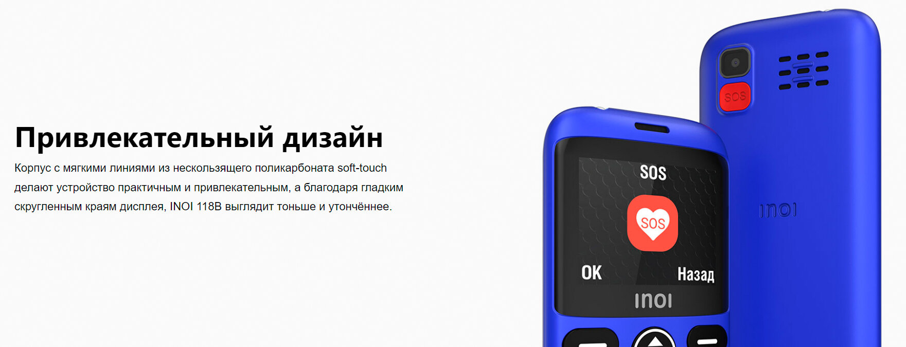 На телефоне предусмотрена кнопка SOS, предназначенная для безопасности владельца. Устройство можно запрограммировать так, чтобы при нажатии кнопки звучала громкая сирена, а также отправлялось сообщение о происшествии доверенным контактам (близким людям или экстренной службе) с заранее написанным текстом. INOI 118B имеет крупные кнопки с большими цифрами и буквами, а также увеличенный шрифт и иконки меню, чтобы сделать устройство максимально комфортным для владельца. Кроме того, у телефона предусмотрено голосовое сопровождение нажатых кнопок, что призвано упростить пользование телефоном людям с ограниченными возможностями зрения. Для быстрой и комфортной зарядки в комплекте поставки имеется док-станция.