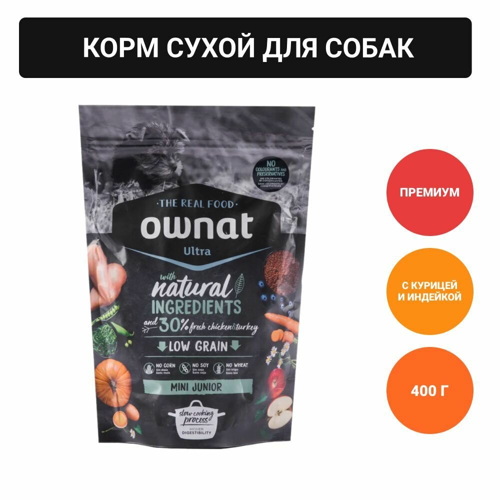 OWNAT ULTRA. MINI JUNIOR – это ежедневный сбалансированный рацион для щенков мелких пород, произведённый в Испании. В основе корма лежит максимальное количество натуральных ингредиентов: свежее мясо, цельное зерно, свежие овощи и фрукты, а также водоросли, что позволяет донести до питомца пользу продуктов в том виде, в каком задумала природа.При изготовлении корма используется подход slow-cooking (слоу-кукинг, «медленное приготовление»): этот инновационный метод приготовления на низких температурах в течение продолжительного времени позволяет достичь исключительного усвоения питательных веществ.1. Наибольшая польза от каждого ингредиента.2. Улучшенные вкусовые качества.3. Высокое усвоение организмом питательных веществ.Преимущества:1. Корм учитывает особенности стремительно растущего организма собак мелких пород, поэтому содержит высокое количество калорий и питательных веществ. Также идеально подходит для беременных и кормящих собак.2. 30% свежего мяса цыплёнка и индейки гарантирует вкусовую привлекательность для питомца, а общее содержание мяса, мясных и рыбных ингредиентов превышает 50%.3. Пониженное количество злаков: корм содержит только цельное зерно – лучший источник клетчатки, витаминов и минералов.4. Без сои, пшеницы и кукурузы – основных пищевых аллергенов для собак.5. Альтернативные источники углеводов – корни маниока, свежие овощи, фрукты и водоросли – содержат высокое количество диетической клетчатки, а также комплекс необходимых микро- и макроэлементов.6. Глюкозамин и хондроитин – дополнительные добавки для поддержки развития скелета и суставов в активной фазе роста щенка.