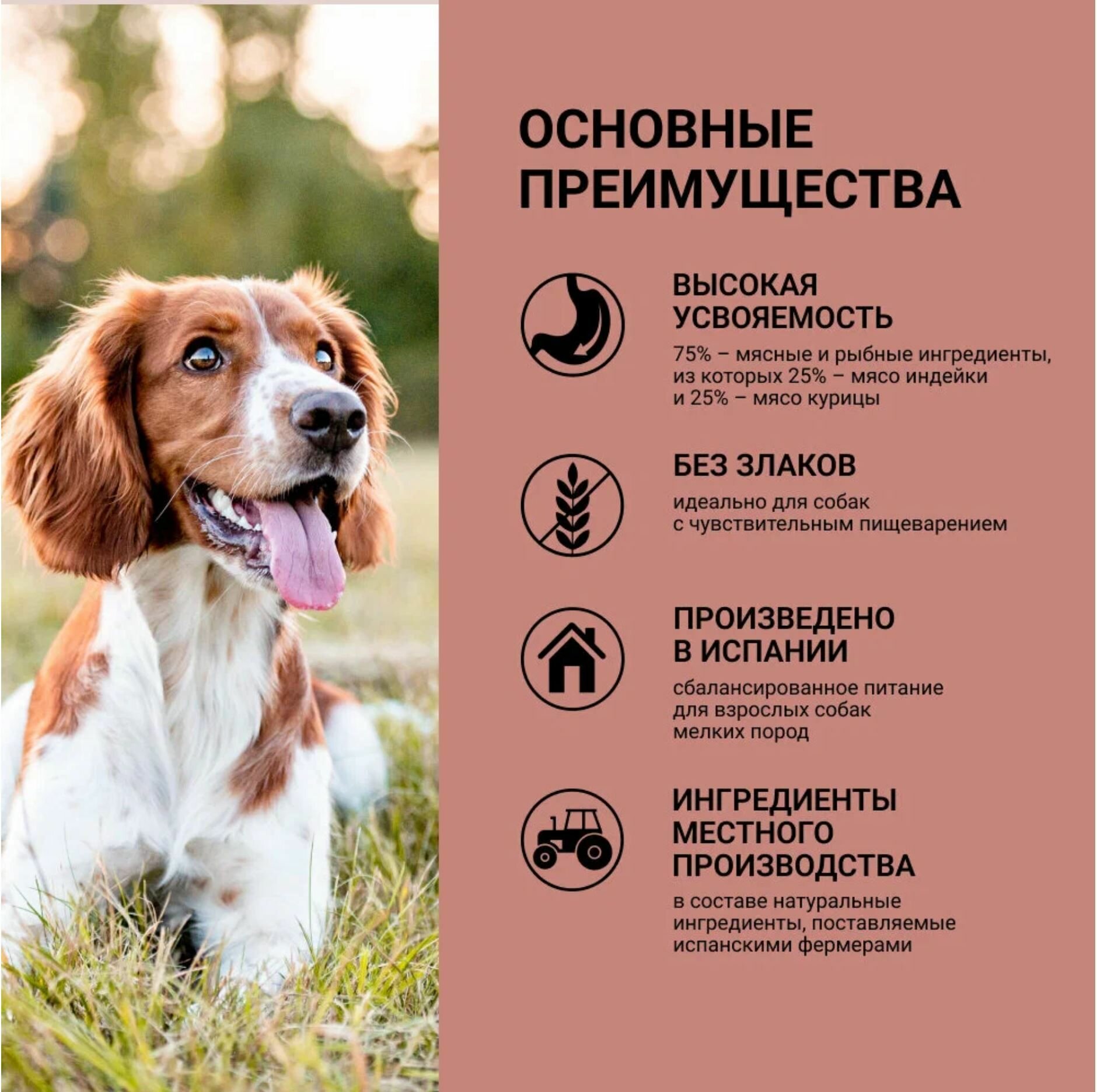 OWNAT GRAIN FREE PRIME. MINI CHICKEN & TURKEY– это ежедневный сбалансированный рацион для взрослых собак мелких пород, произведённый в Испании.Беззерновой корм с мясом индейки и курицы не содержит злаки и существенно снижает риск возникновения пищевой аллергии.OWNAT GRAIN FREE PRIME. MINI CHICKEN & TURKEY – это:1. 75% корма – ингредиенты животного происхождения;2. 25% состава – это альтернативные источники углеводов: натуральные овощи и фрукты;3. повышенное содержание белков - 37% и пониженное содержание углеводов;Специально для мелких пород, удовлетворяя их потребность в калориях для активного образа жизни. Специальный размер и форма гранул позволят легко разжёвывать корм.В основе корма лежит максимальное количество натуральных ингредиентов: свежее мясо, свежие овощи и фрукты, а также водоросли, что позволяет донести до питомца пользу продуктов в том виде, в каком задумала природа.Преимущества:1. Без злаков: идеально для собак, склонных к аллергии или с чувствительным пищеварением.2. 50% индейки (25%) и цыплёнка (25%) гарантирует вкусовую привлекательность для питомца, а общее содержание мяса, мясных и рыбных ингредиентов составляет 75%.3. Альтернативные источники углеводов – корни маниока, свежие овощи, фрукты и водоросли – содержат высокое количество диетической клетчатки, а также комплекс необходимых микро- и макроэлементов.4. Глюкозамин и хондроитин – дополнительные добавки для профилактики болезней суставов, наиболее часто встречающаяся проблема у собак крупных пород.