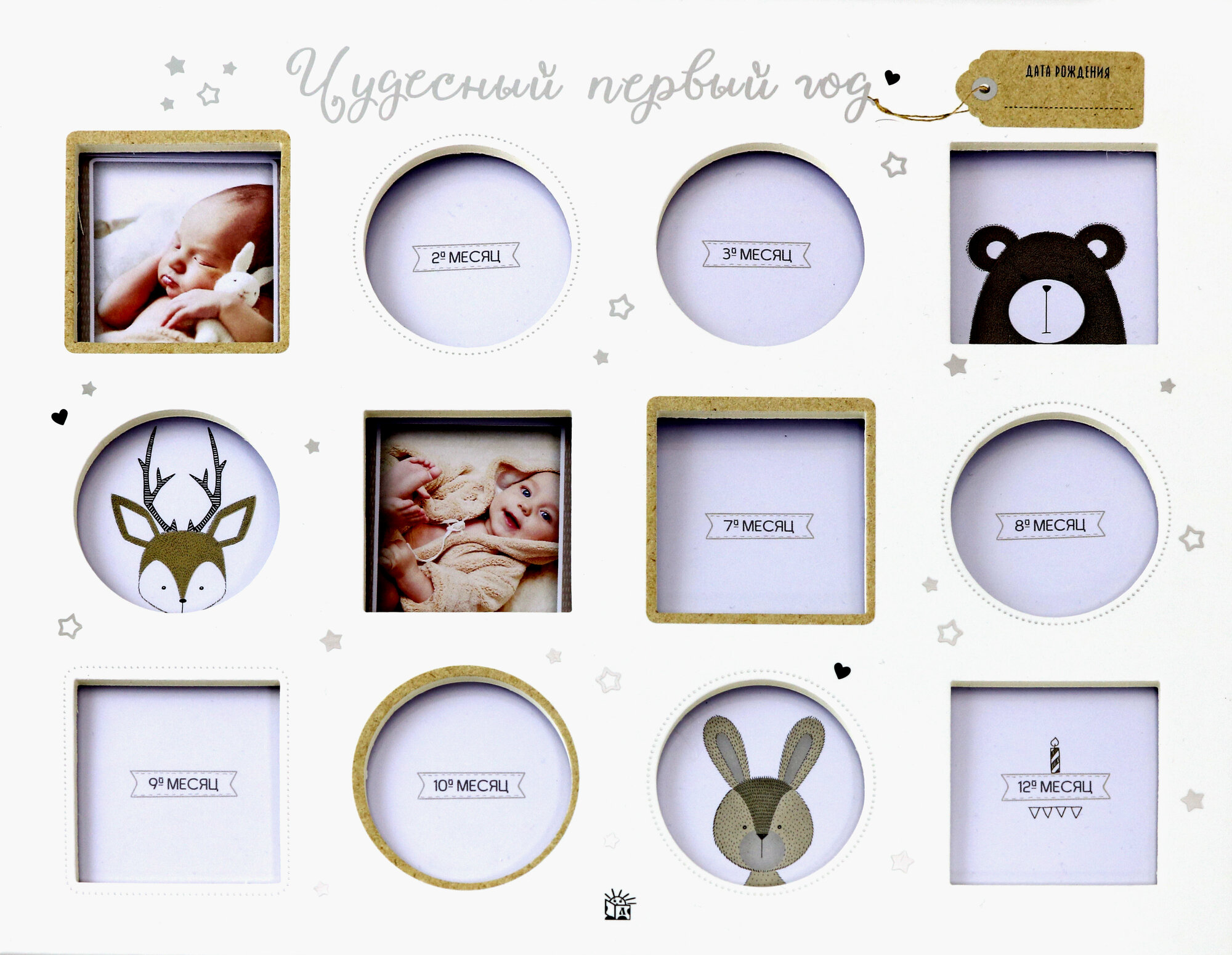 В первый год дети меняются так быстро! Каждому месяцу первого года жизни здесь посвящен отдельный разворот. Сюда можно записать все трогательные мелочи вроде хит-парада любимых дел и игрушек, размера одежды в три месяца или первых попробованных продуктов. На каждую страницу можно наклеить фотографии, и альбом превратится в яркий и уникальный скрап-бук. А обложка альбома - настоящая рамка для 12 фотографий, по одной на каждый месяц года. Завязав специальные ленточки, альбом-рамку с фотографиями можно поставить на стол или книжную полку.