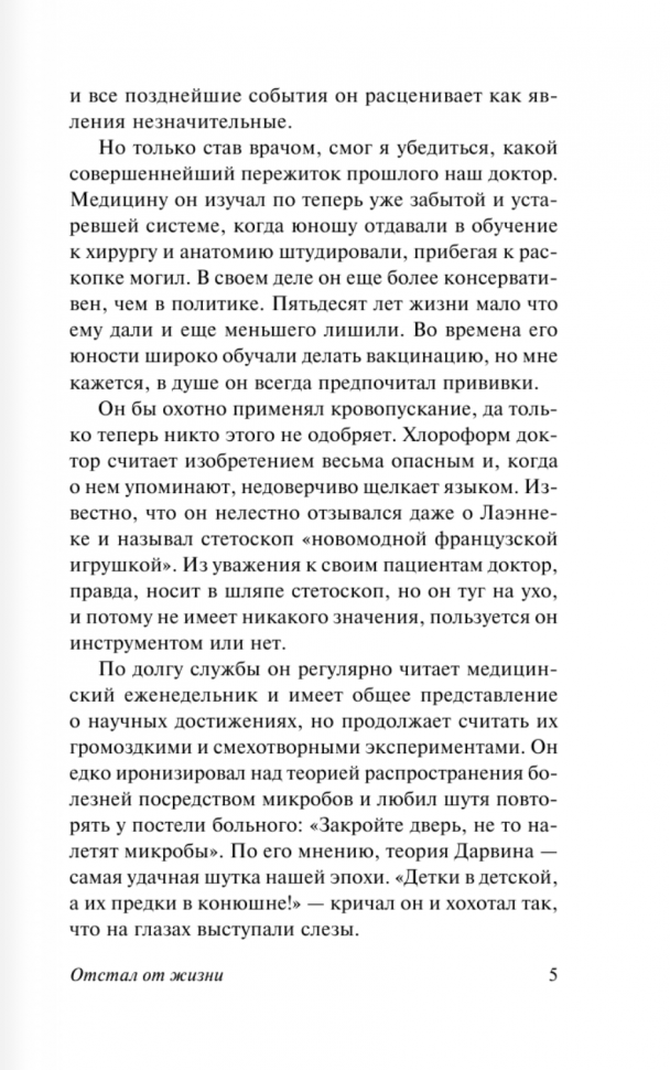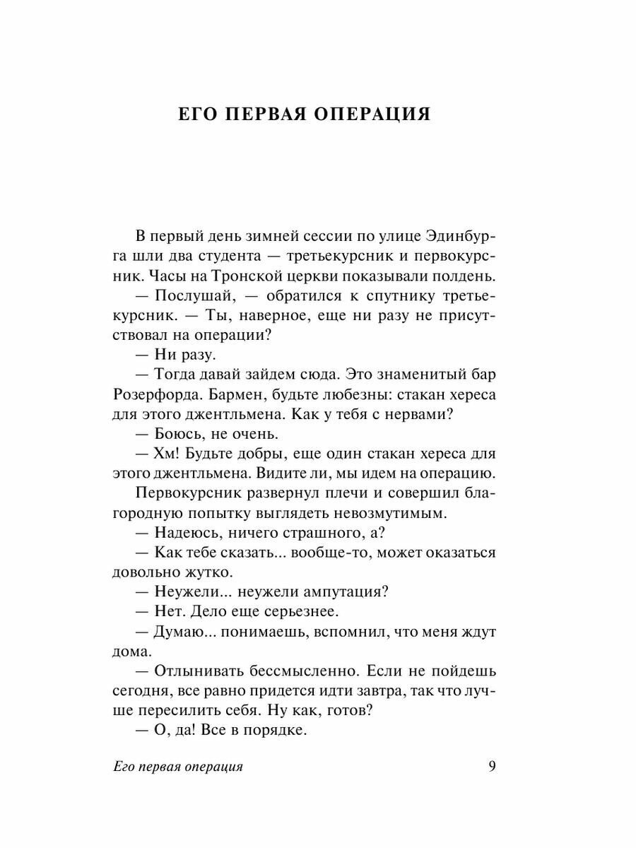 Замечательный сборник рассказов о врачах и пациентах. Тексты разные:одни с налётом мистики, другие романтические, иные вполне реалистические. Я купила книгу из-за любимого в этом жанре рассказа "Отстал от жизни", который надо ввести в обязательный список для прочтения студентам-медикам. Ещё особо выделю "Влюблённые", "Вопрос дипломатии", "Супруга физиолога" и, конечно, смешное повествование о человеке, увлёченном книжным знанием "Сцены в стиле Борроу". Словом, приятное и небесполезное чтение!