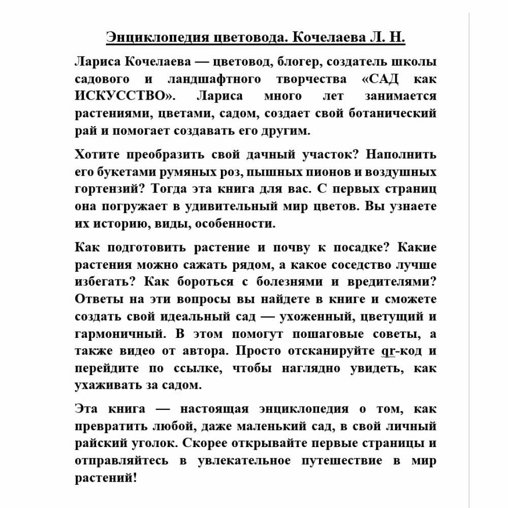 \"Энциклопедия цветовода\" - это отличная книга для всех, кто увлечен садоводством и желает вырастить красивые и здоровые растения. Автор Лариса Кочелаева на протяжении всей книги дает четкие и понятные инструкции по уходу за растениями, начиная от выбора правильного места для посадки и заканчивая обрезкой и профилактикой заболеваний.