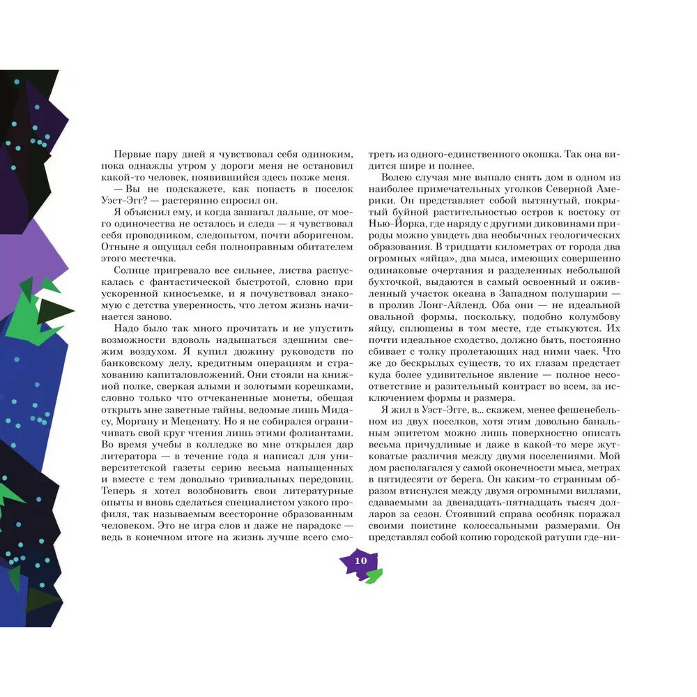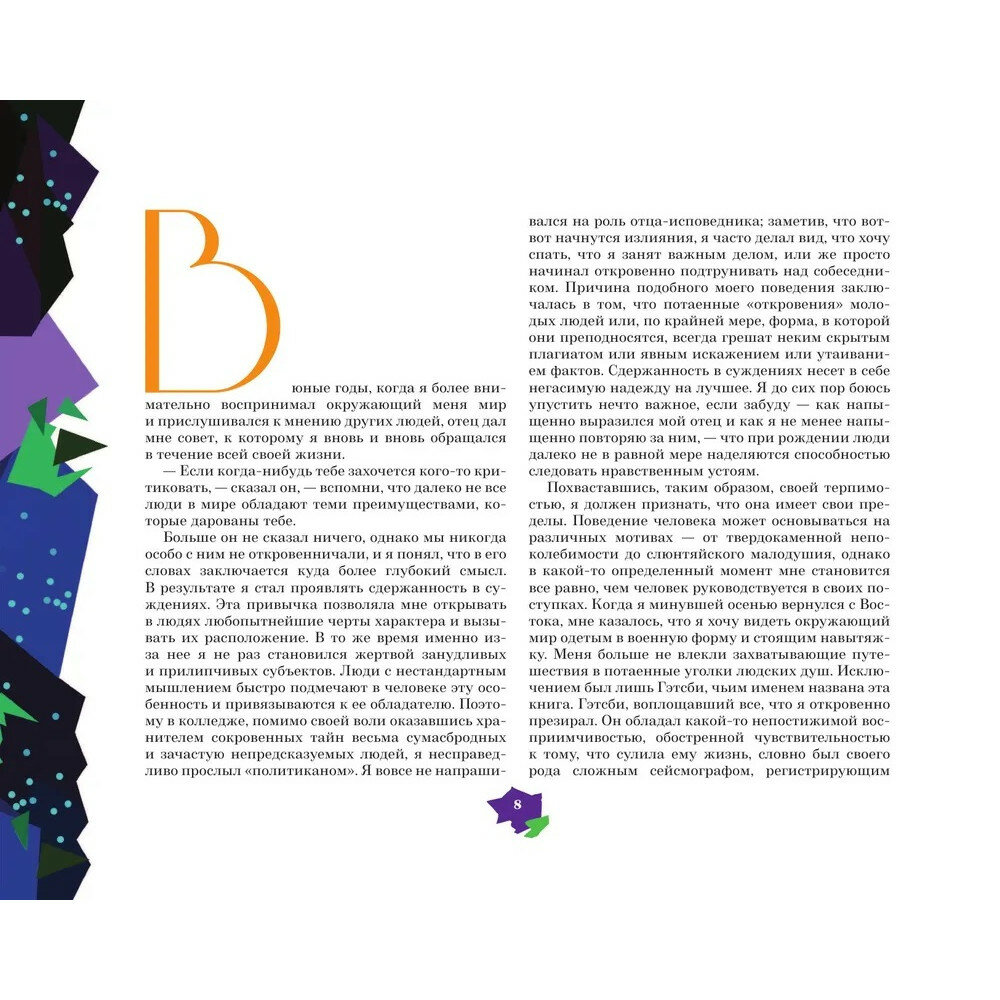 Через трагическую судьбу главного героя – Джея Гэтсби, всю жизнь стремящегося попасть в элиту нового общества миллионеров, автор показал: какое бы положение не занимал человек, главным в жизни всегда остаются дружба, достоинство и, конечно же, любовь. Издание органично дополняют авторские иллюстрации Анастасии Буравлевой.