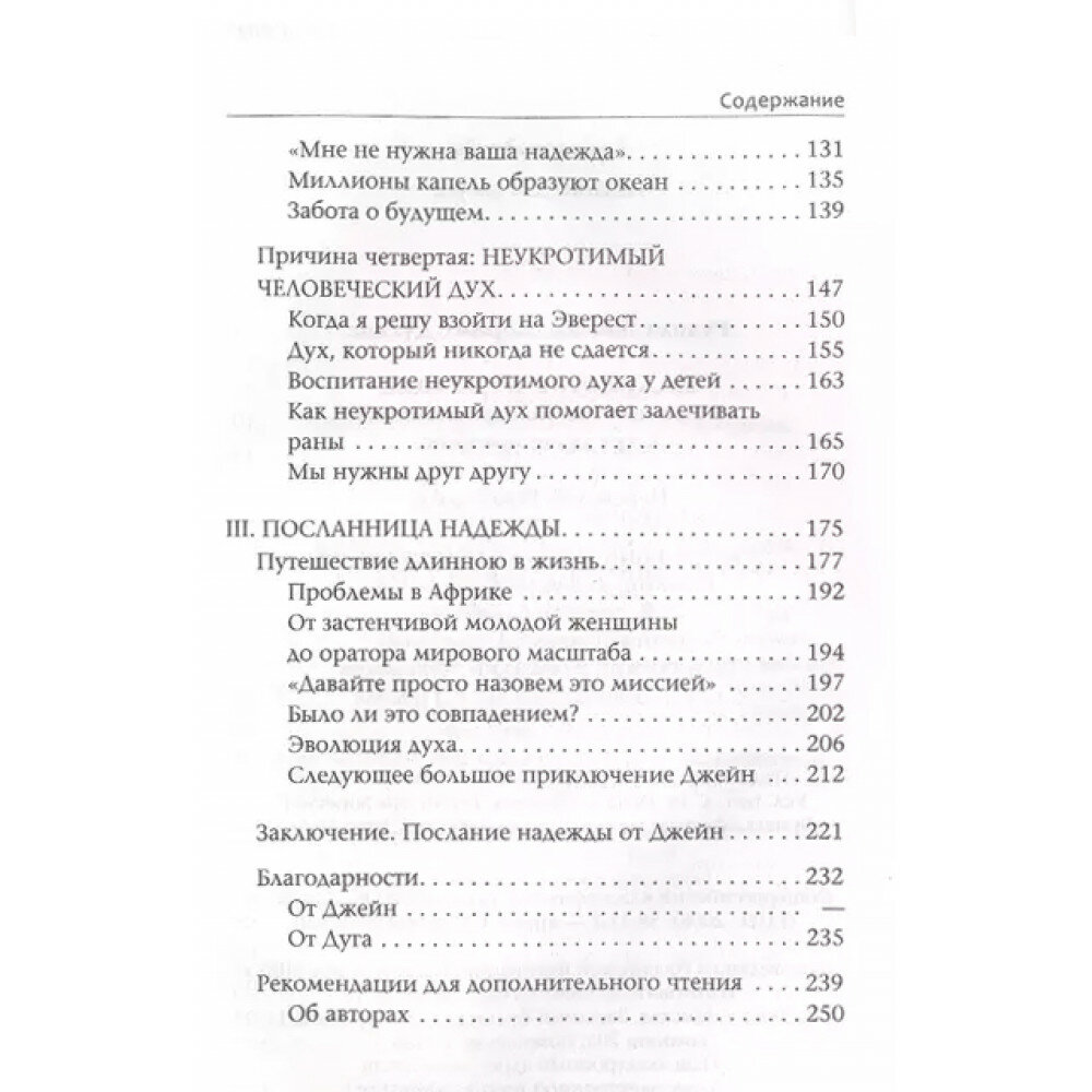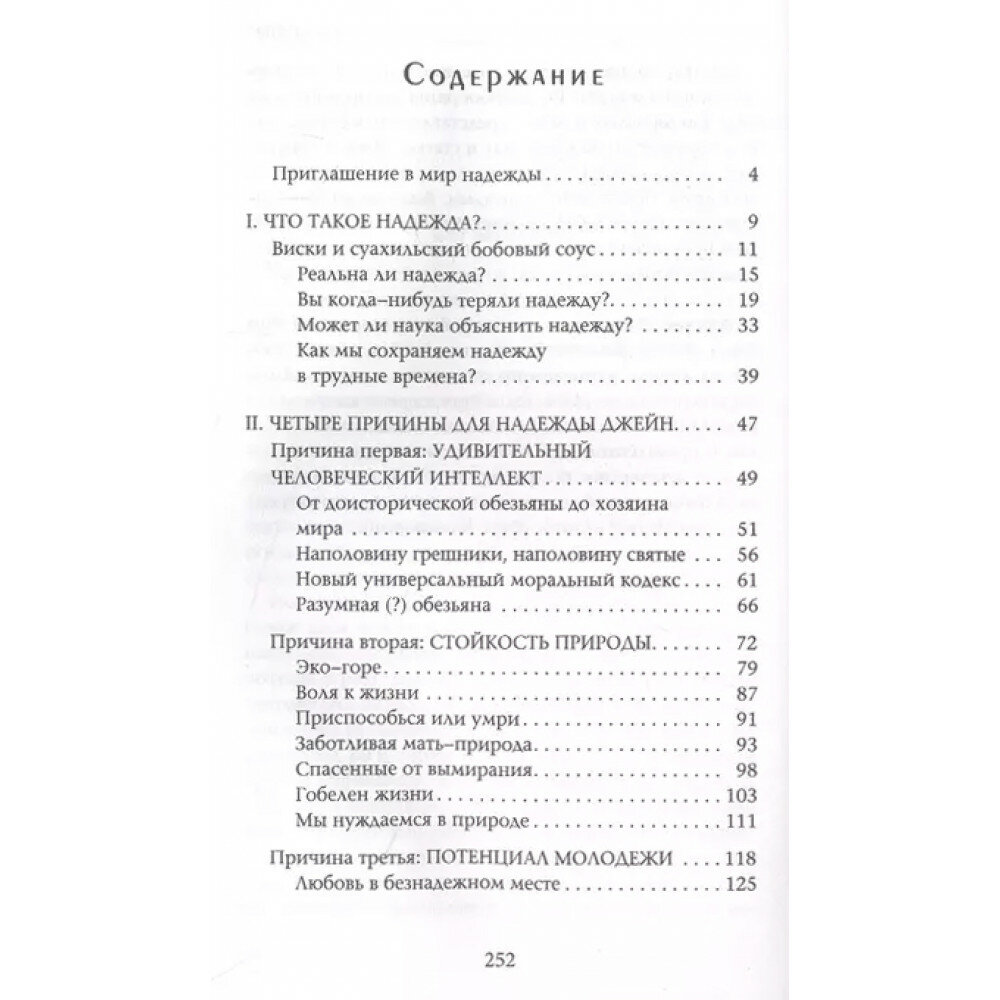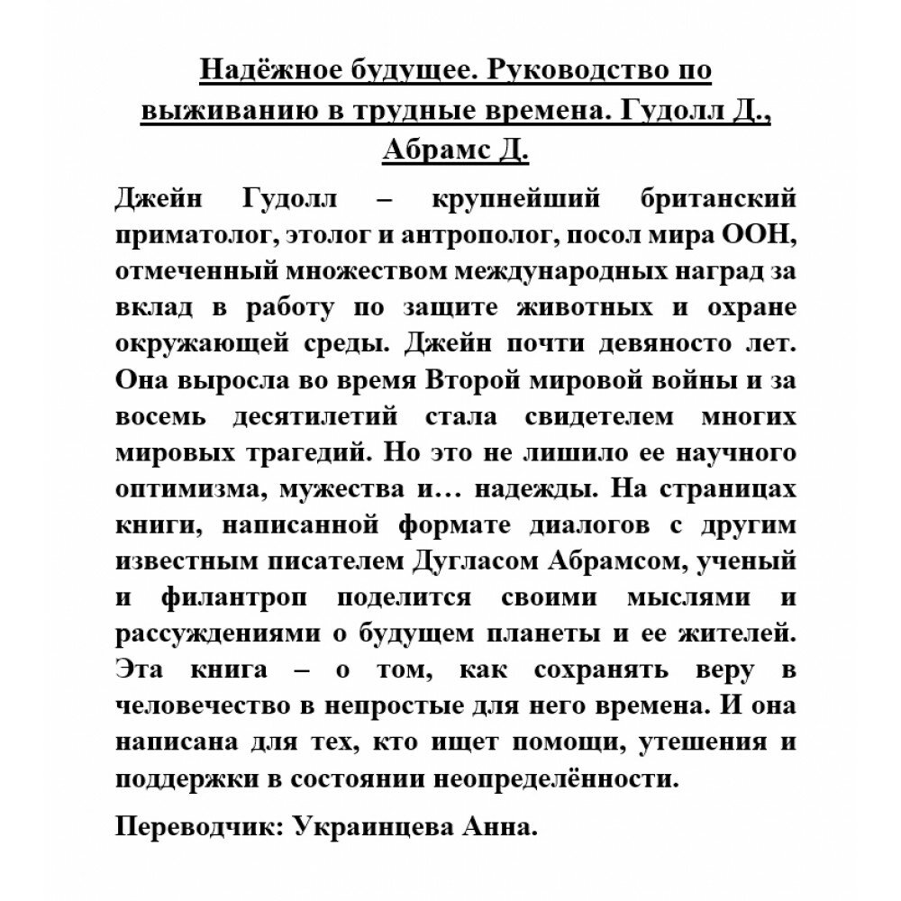 Личность Джейн Гудолл, которой на днях исполнилось 89 лет, вызывает огромное искреннее уважение, а возможность почерпнуть от её жизненного опыта и мудрости - настоящая удача и радость. Российский читатель давно знаком с книгами Джейн, посвященными её исследованиям мира животных (шимпанзе, гиены), но она - автор многих других книг, пять из которых имеют в названии слово "надежда". Эти книги посвящены более широким проблемам - состоянию природы, мира и человеческого общества. И вот - первая из этих книг, переведённая на русский язык (в оригинале она называется "Книга надежды", издана в 2021 году).