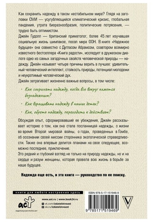Джейн Гудолл – крупнейший британский приматолог, этолог и антрополог, посол мира ООН, отмеченный множеством международных наград за вклад в работу по защите животных и охране окружающей среды. Джейн почти девяносто лет. Она выросла во время Второй мировой войны и за восемь десятилетий стала свидетелем многих мировых трагедий. Но это не лишило ее научного оптимизма, мужества и… надежды. На страницах книги, написанной формате диалогов с другим известным писателем Дугласом Абрамсом, ученый и филантроп поделится своими мыслями и рассуждениями о будущем планеты и ее жителей. Эта книга – о том, как сохранять веру в человечество в непростые для него времена. И она написана для тех, кто ищет помощи, утешения и поддержки в состоянии неопределённости.