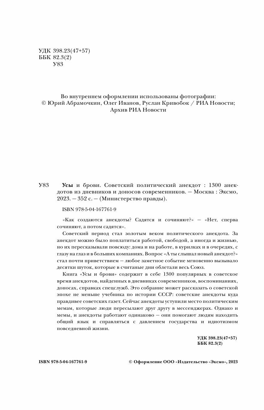 Сервис сравнения цен СкидкаГИД предлагает сравнить цены на товар «Книга: Усы и брови. Советский политический анекдот (без автора); Эксмо, Редакция 1, 2023»