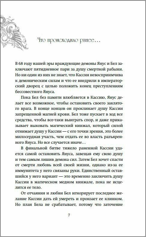 Две тысячи лет Белиал искал свою возлюбленную, и наконец ему удалось найти душу Кассии. Но пока дьявол беспокоится о возвращении девушки, надвигается новая угроза. В битве против королевы ведьм сотни душ вырвались из Тихого омута — тюрьмы праймусов, среди которых оказался Янус, когда-то укравший душу Кассии. Теперь смертной предстоит столкнуться не только с современным миром, который она не знает, но и с демонами, претендующими на ее душу и сердце.