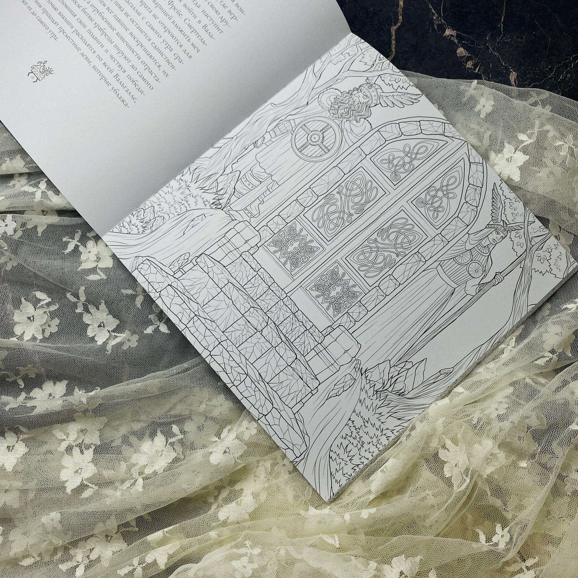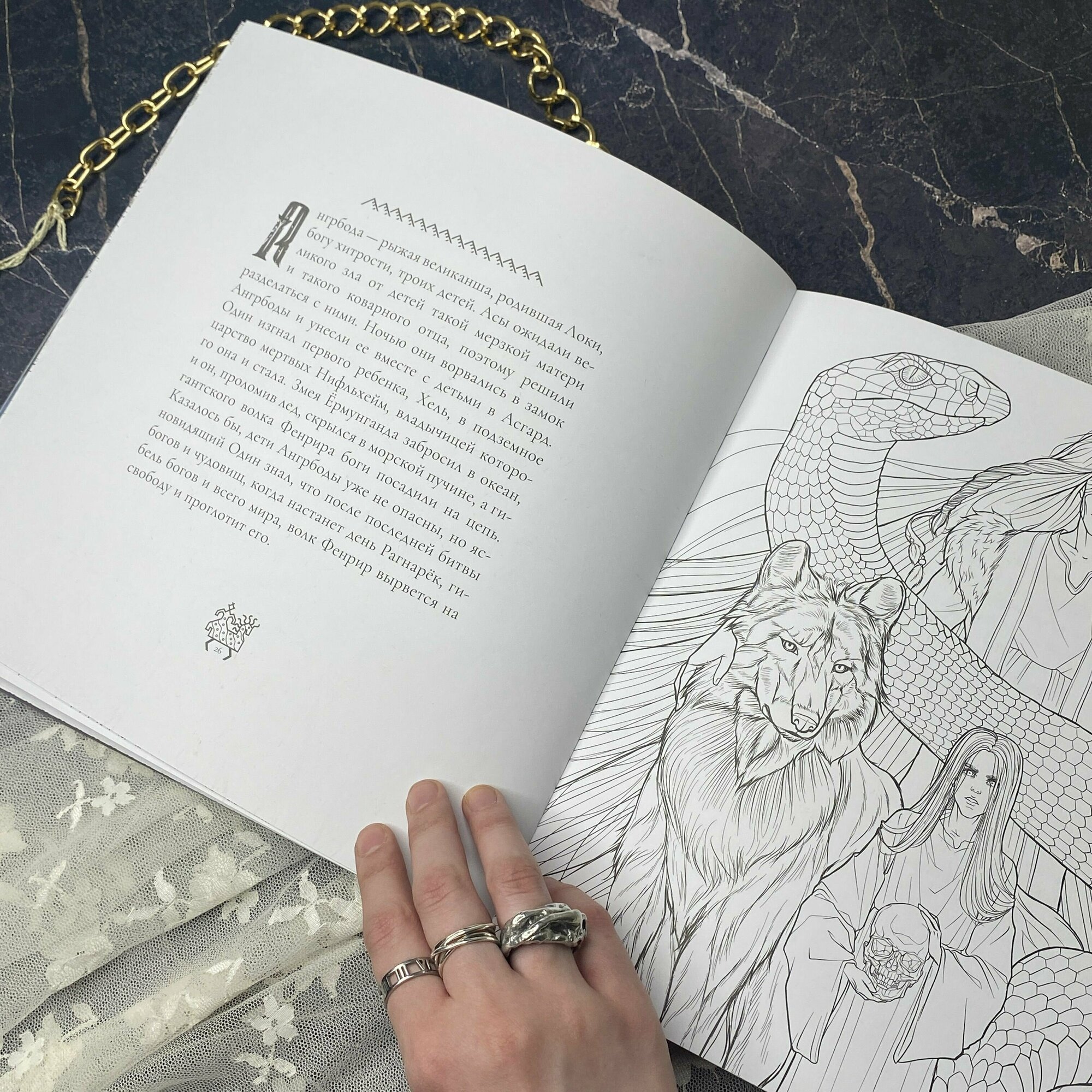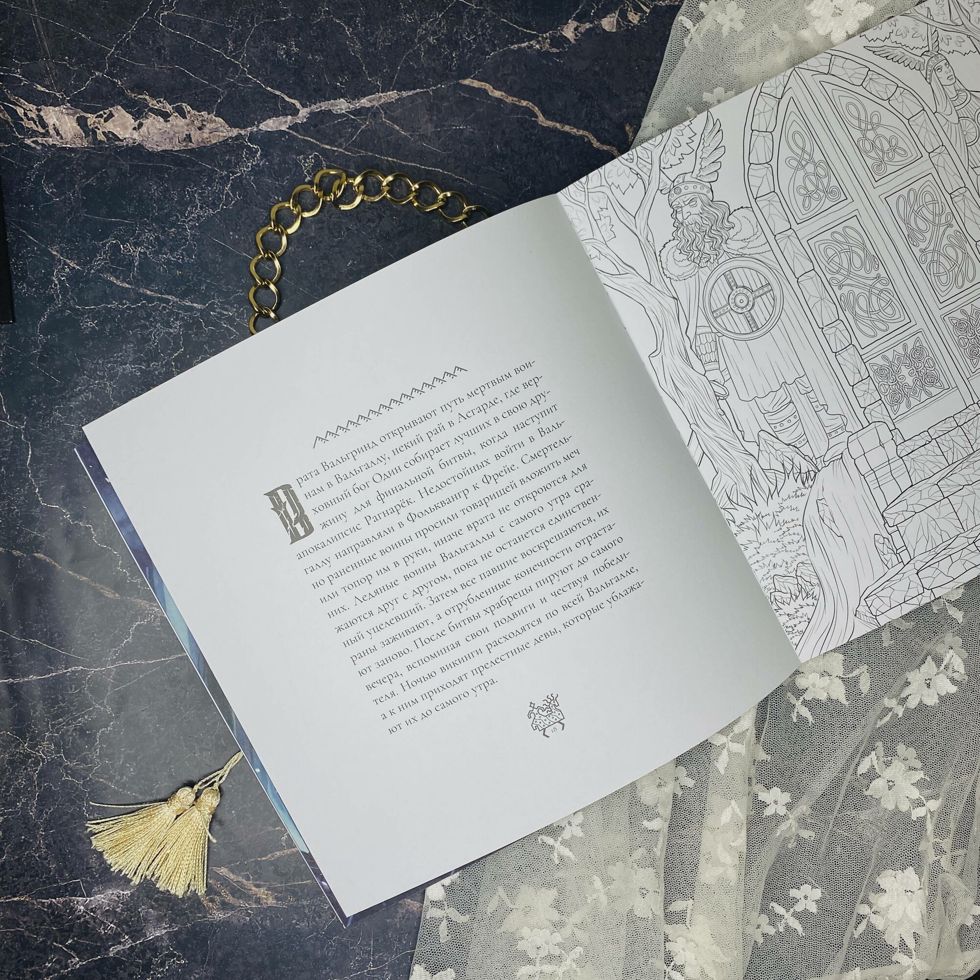 Очень крутая раскраска для взрослых. Идеальна как антистресс-раскрасска с тематическим наполнением в виде сюжетов древнескандинавских мифов.