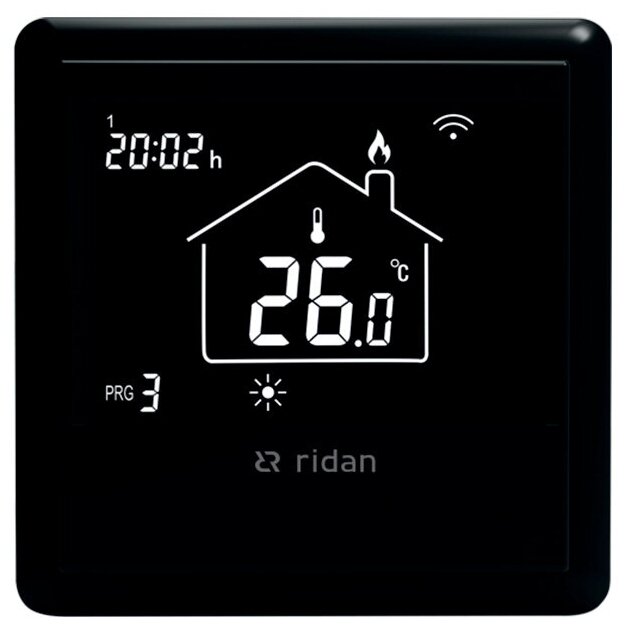 Программируемый электронный комнатный термостат Ридан WT-RB 230V черный корпус и дисплей встр. Комнатный термостат Ридан WT-RB 088U0628R, 230 В, программируемый, электронный, встраиваемый