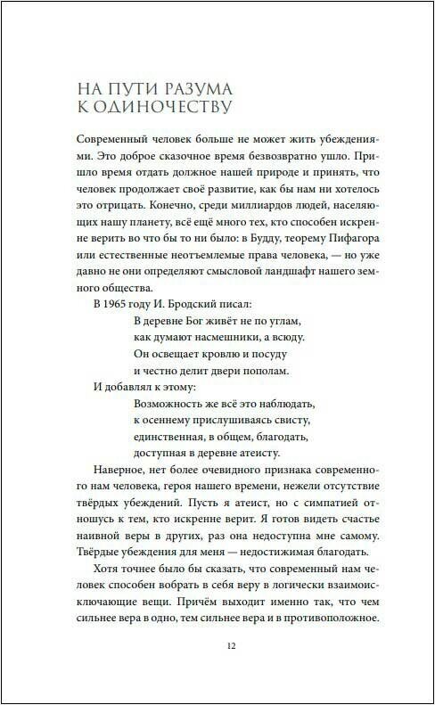 Человечество повзрослело. Современный человек больше не может жить убеждениями. Он перерос «веру» как доминирующий способ формирования мировоззрения. Он уже не верит без оглядки во что бы то ни было: в Будду, теорему Пифагора или естественные неотъемлемые права человека. Скорее, он верит в логически взаимоисключающие вещи. Причём выходит так, что чем сильнее вера в одно, тем сильнее вера и в противоположное.
