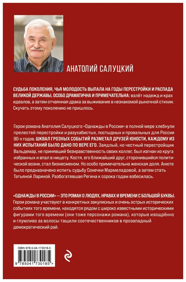 Роман «Однажды в России» будет интересен читателям разных возрастов — как старшему поколению, так и сорокалетним, и совсем юным. Автор описывает события, происходящие в драматическую, переломную эпоху в истории нашей страны. Не столь далекую и современникам хорошо известную, но уже слегка присыпанную пылью времени и пока не до конца осознанную. Книга повествует о судьбах двадцатилетних, угодивших в штормовые перестроечные и лихие 90-е годы. Это современная история об «унесенных ветром», любимых и любящих, обстоятельствами времени и жизни разбросанных по городам и весям. Главные герои, Вальдемар и Анна, вынуждены принимать непростые решения: с кем они? Что для них высшее благо? Что допустимо, а через что переступить невозможно? Где заканчивается самопожертвование и начинается предательство своих идеалов?